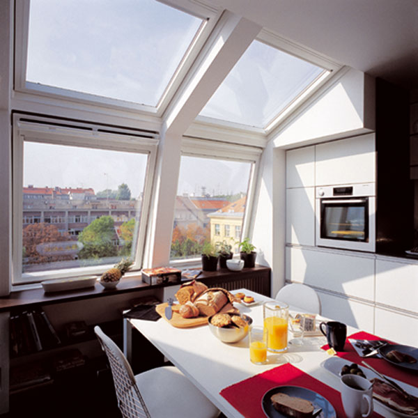Na rozšírenie obytného priestoru za hranice pôvodného bytu môže poslúžiť aj nevyužívaná terasa v najvyšších podlažiach. Stačí, ak ju vhodne zasklíte. Strešné okná veľkých rozmerov vytvoria novú obvodovú stenu, ich zošikmenie pritom nenarúša pôvodnú fasádu, pretože z pohľadu ulice takúto zmenu chodec takmer nevníma. Kombináciou rôznych sklonov okien môže nový priestor navyše získať dostatočnú podchodnú výšku a plnohodnotne sa dá využiť celá pôdorysná plocha na bývanie.