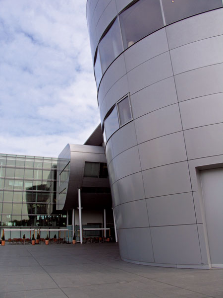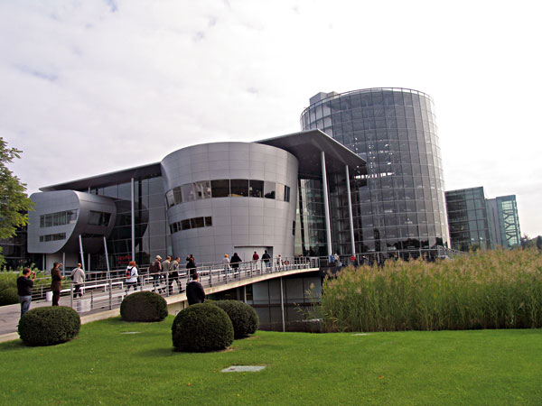 Z tejto strany objekt prekvapuje okoloidúcich kompozíciou rozličných organických a futuristických foriem, ktoré vystupujú z pravouhlej zasklenej konštrukcie. Architekt takto obohatil vstupnú časť deväťpodlažného objektu, ktorý ukrýva montážne priestory. Ohňostroj organických tvarov však má svoje logické usporiadanie a v skutočnosti je stvárnením jednotlivých oddelení a prevádzok multifunkčného interiéru. Výškovou dominantou tohto mnohoznačného obrazu a pastvou pre oči nadšencov luxusných automobilov je vysoký vežovitý cylindrický objekt, ktorý symbolizuje valec motora.
