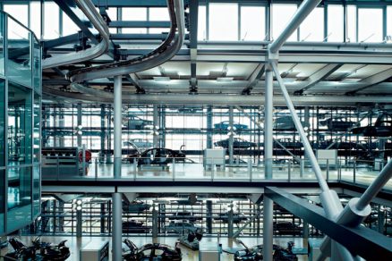Dodacie a distribučné sektory sa nachádzajú ukryté v zadnej časti objektu a pod úrovňou terénu. Výrobné priestory sú presvetlené, vzdušné a jasne členené. Jemné osvetlenie montážnych liniek, ktoré sa vinú objektom v tvare písmena L, pripomína skôr ateliér než neosobné neónové výrobné haly. Aj samotná podlaha protirečí tradičným predstavám o fabrike: je vyrobená z ušľachtilého javorového a dubového dreva. Rovnaký materiál sa použil aj na široké bežiace pásy. Zapustili sa do podlahy, aby zabezpečili pohodlný presun áut do jednotlivých zón montážnej haly.