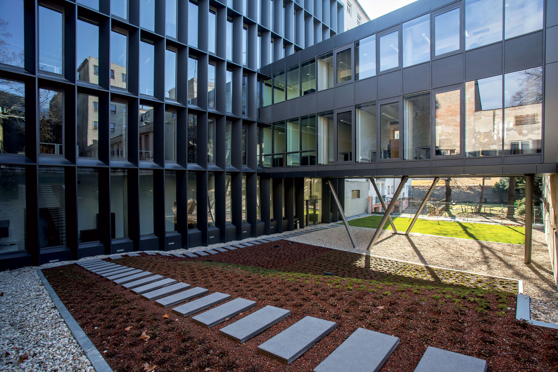 Kompaktný tvar, vertikálny raster, pravidelný rytmus fasády akcentovaný zaskleným portálom vstupnej haly s nástupným schodiskom a markízou – a to celé v tmavej farebnosti. Nový administratívny objekt nedávno vyplnil prieluku na Pražskej ulici.