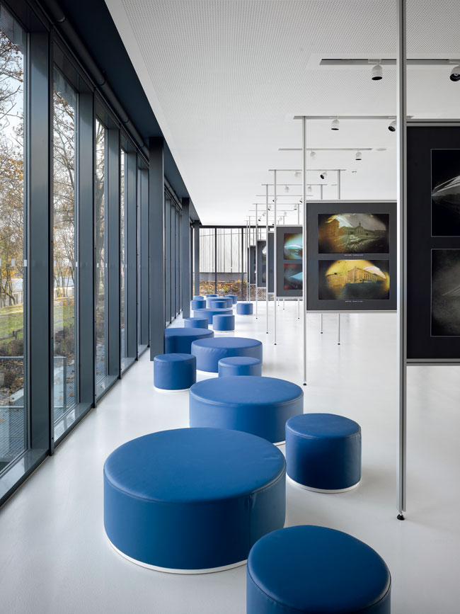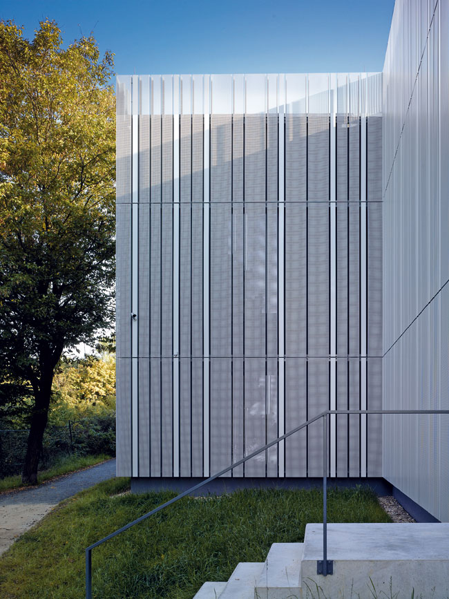 „Hľadali sme spôsob, ako členitý pôdorys a rôzne výšky obvodového plášťa zjednotiť do logického celku,“ vysvetľuje Martin Rudiš dôvod, prečo zvolili predsadený kovový plášť fasády, ktorý sa stal hlavným výrazovým prvkom exteriéru. „Dôležité bolo, aby fasáda svojím materiálovým a technickým stvárnením prezrádzala obsahovú náplň budovy,“ hovorí architekt. Pôsobí ľahko a zároveň jednoznačne. Čiastočnú transparentnosť sme dosiahli perforáciou. Jemná textúra dodáva stavbe krehkú a odľahčenú estetiku.“