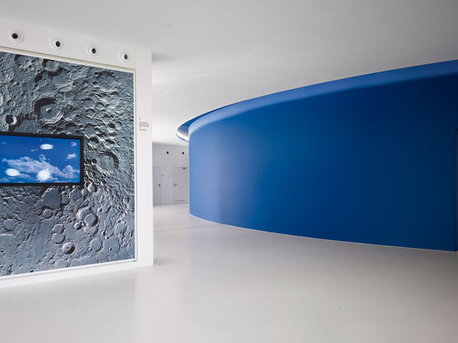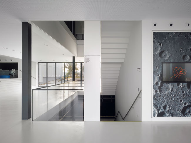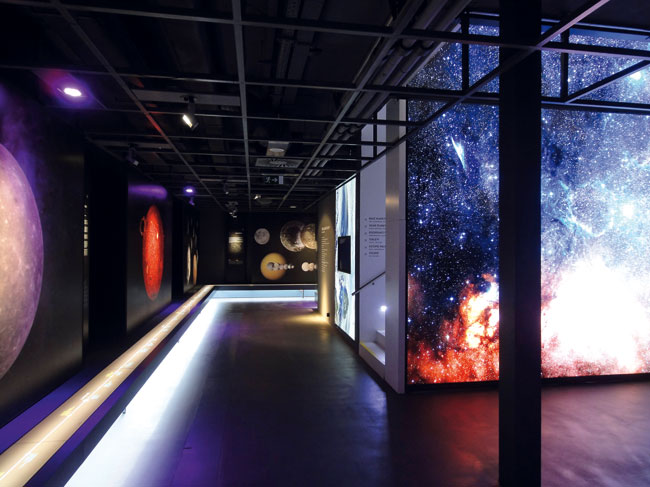 Napriek členitosti stavby a navzájom sa prelínajúcim priestorom je interiér budovy prehľadný, jednoduchý a ľahko čitateľný. Prevládajúca biela farba na stenách a modrý povrch obvodovej steny kruhovej sály veľkého planetária poskytujú „pokojný a monotónny priestor na veľké atraktívne plochy s podsvietenými obrazmi hviezdnych krajín.“