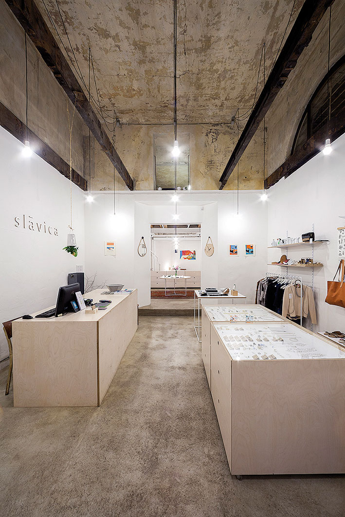 Heslom: „V jednoduchosti je krása“, sa riadili autori Obchodu Slávica: „Obchod je vsadený do parteru mestského paláca v historickom jadre Bratislavy. Pracuje s pôvodným vnútorným priestorom tak, že ho očisťuje od novších stavených zásahov a odkrýva stavebnú podstatu jeho historických vrstiev. Nové prvky interiéru sú reverzibilné, aby zbytočne neprekrývali pôvodné konštrukcie. Koncept interiéru je navrhnutý tak, aby vytváral jednoduchý podklad pre vystavený tovar, čiže šperky a predmety úžitkového dizajnu“, opisuje základný koncept diela Andrej Olah.