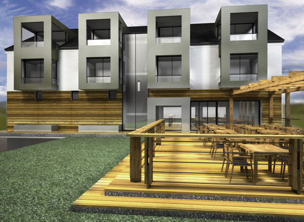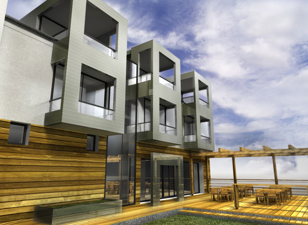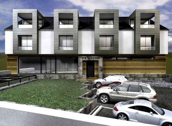 Architektúra rešpektuje pôvodnú sedlovú strechu. V nej je vytvorená štvorica vikierov na obe strany budovy. Celé podkrovie má drevenú konštrukciu a krov je zo systému KONTRAKTING. Vikiere sú obložené tmavosivým predzvetraným titánzinkom a strecha má strešnú krytinu zo systému CEMBRIT v tmavosivej farbe. Fasáda je sčasti omietnutá smotanovou omietkou a horizontálne obložená termodrevom. Celý objekt je zateplený systémom BAUMIT Profesional.