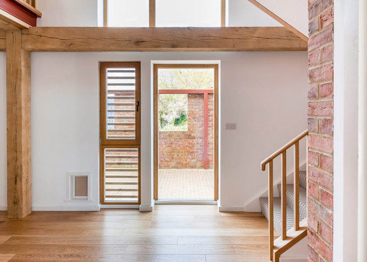 Steny interiéru sú ladené do bielej farby, aby vynikli prvky dreveného rámu.
