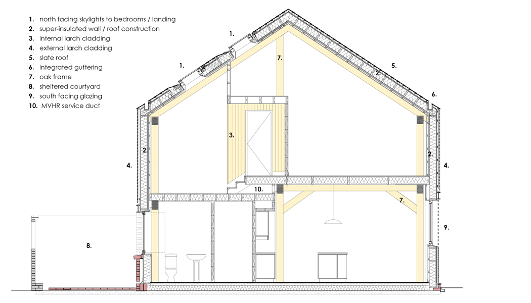 V spolupráci s A-ZERO architects využili pôvodný kovový skelet vyplnený tehlovým múrom, ktorý doplnili o masívnu drevenú rámovú konštrukciu, čím vznikla akási hybridná konštrukcia domu. Ich cieľom bolo využiť čo najviac zo zachovaných materiálov tak, aby stavba harmonicky zapadla do prostredia.