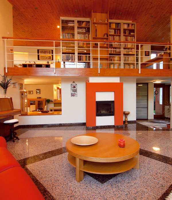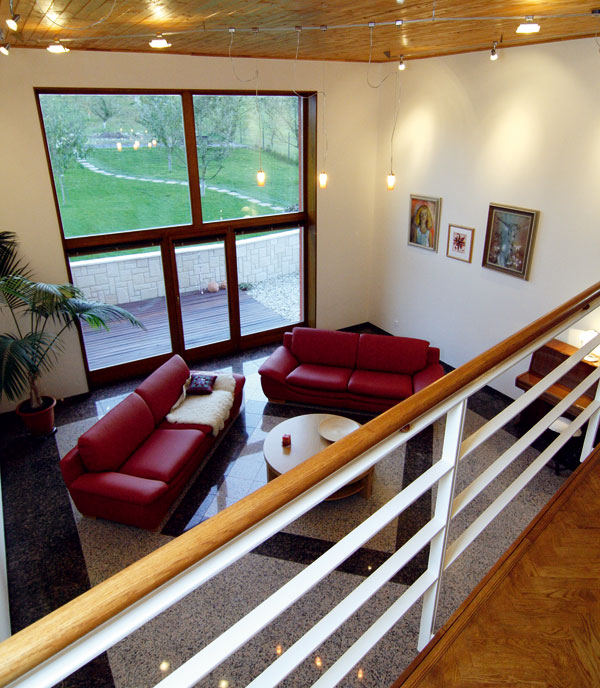 V interiéri na prvom podlaží sme položili podlahu zo žuly. V chladnejšom období príjemne hreje vďaka podlahovému vykurovaniu. Žulou je obložená aj podlaha kúpeľne na druhom podlaží a múr okolo schodiska, ktoré vedie otvoreným priestorom na galériu, k pracovni a spálňam na poschodí. Tu zasa podlahu tvoria dubové vlysky, morené vo farbe okien a dverí. Steny sú v celom dome omietnuté štukovou omietkou a stierkou. Na zateplenie atmosféry sme na poschodí s výnimkou kúpeľne nechali podhľad zhotoviť z tatranského profilu. V kúpeľni stačil sadrokartón. Konštrukcia schodiska je síce oceľová, ale stupne tvoria drevené dubové dosky; rovnaké drevo sa použilo na držadlá na zábradlí.
