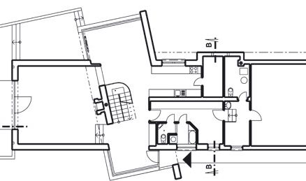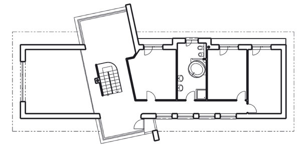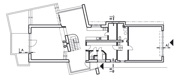 Spálne a detská izba sa ocitli na hornom poschodí v dlhšej časti väčšieho kubusu. Pod nimi, na prízemí domu, je technické zázemie, šatníková miestnosť a garáž. Garážové dvere sa takto otvárajú na menej výpravnej fasáde domu, ktorú tiež prikryli atypickou strechou.