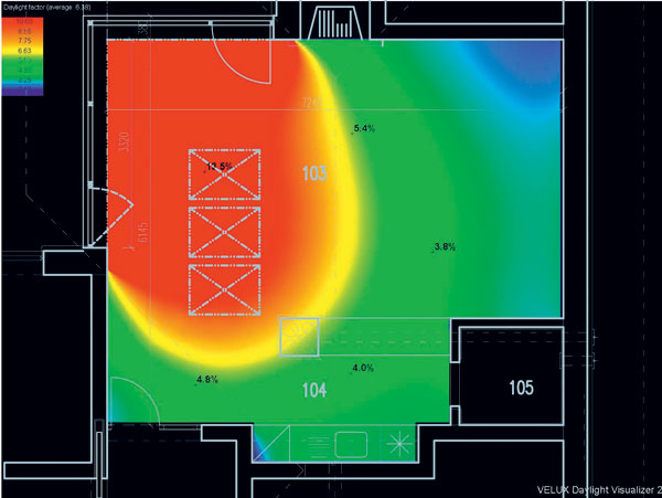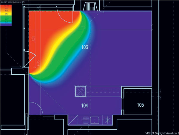 V prípade použitia rôznych foriem presvetlenia obytného interiéru je dôležitý pomer denného svetla  v interiéri a exteriéri. Svetlotechnici posudzujú jednotlivé miestnosti podľa činiteľa dennej osvetlenosti, ktorý tento pomer určuje z rovnomerne zamračenej oblohy tak, aby bolo možné porovnávať rôzne typy presvetlenia za rovnakých vonkajších podmienok. V tomto prípade ide o posúdenie obývačky v bungalove s trojicou strešných okien.