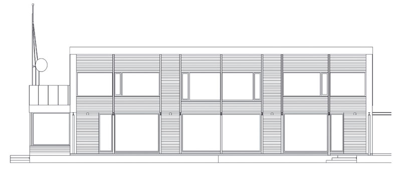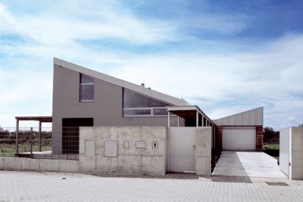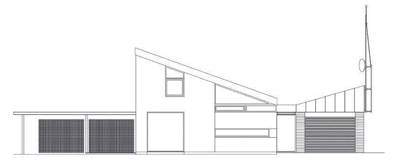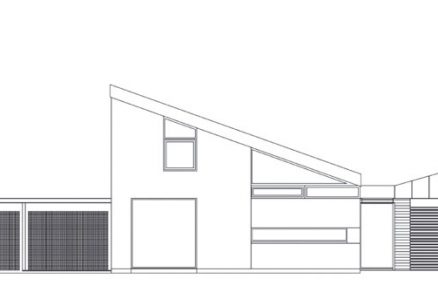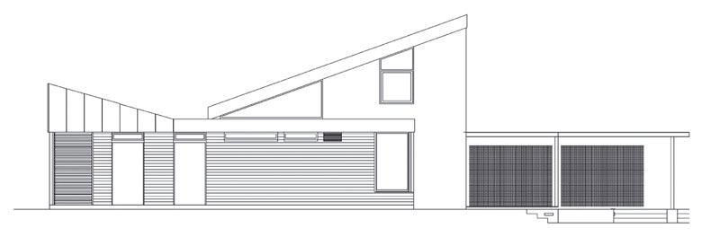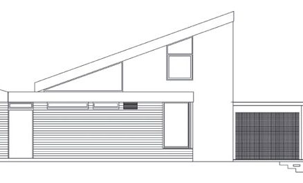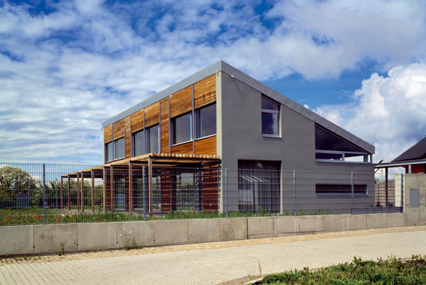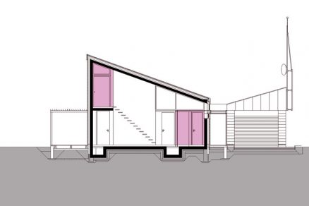 Ak neodhliadneme od určitej oddelenosti vlastného domu od garáže, tvorí celok sústavu dvoch pultových striech a výsledný vertikálny rez je tak súhrou dvoch trojuholníkov s rôzne ostrými uhlami. V prípade, že by boli okolnosti laboratórne sterilné a do hry by nevstúpil rad administratívnych náhod, bola by rovná strecha logickým zavŕšením dominancie horizontálnych plôch. Stavba by možno pôsobila v okolitej zástavbe ako cudzorodý prvok – takmer ako planimetrický útvar medzi pekne podarenou „tradičnou“ stereometriou – ale nárok na začlenenie do okolitej zástavby nebol automaticky nadradený nároku na konštrukčnú logiku stavby.