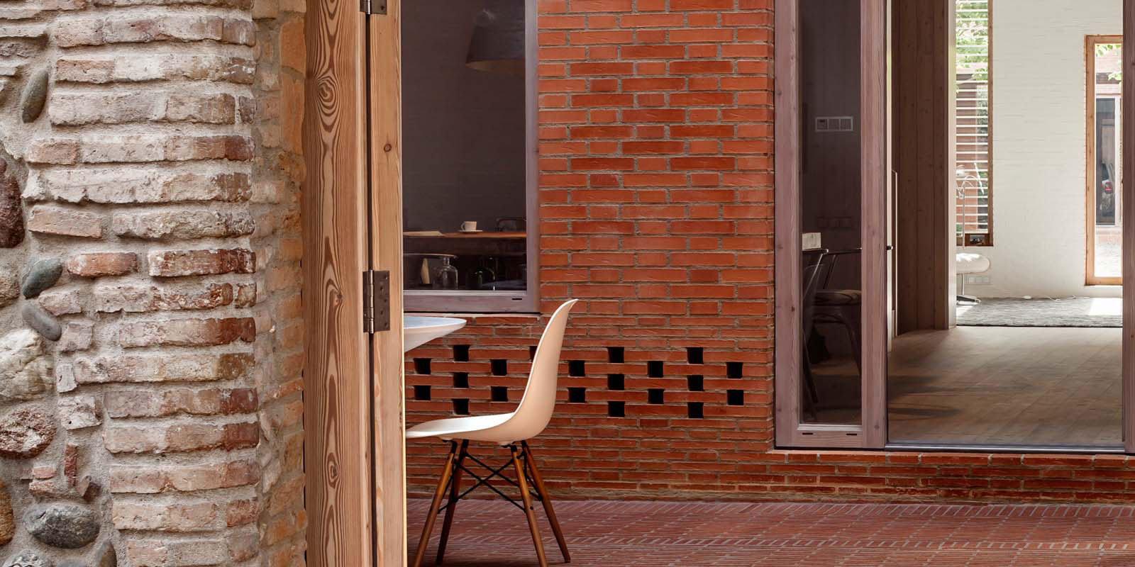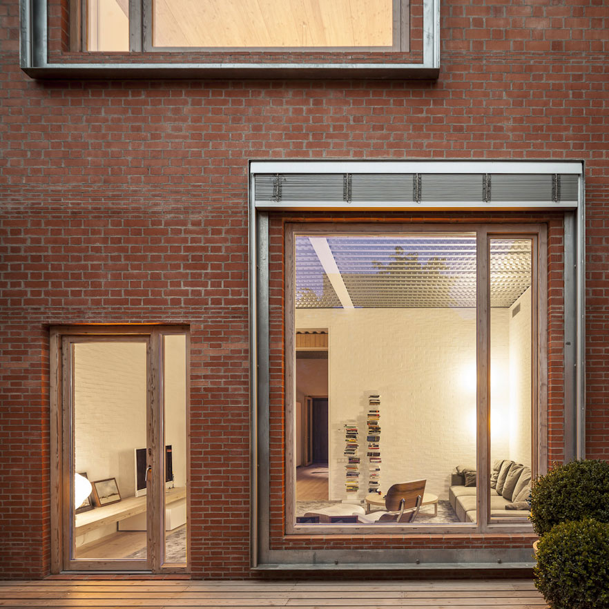 V nadväznosti na uličnú čiaru sa automaticky vytvorili dva stavebné objemy na oboch koncoch pozemku. Medzi jedným a druhým koncom však nájdeme najrôznorodejšie typy priestorov – uzavretý interiér, miestnosti s vyšším i nižším stropom, priestory zastrešené, nezastrešené. I priestory napoly zastrešené a napoly zasklené. Nevykurovaný „predpriestor“, zvaný aj patio, vytvára štedrý vstup i tepelný prechod medzi ulicou a interiérom. Vykurované aj nevykurované časti sa vhodne dopĺňajú a spoločne vytvárajú prízemie, ktorého dĺžka dosahuje až 53 m a má plochu 345 m2. Jednotlivé miestnosti majú rôzne klimatické podmienky, charakter a vlastnosti, ale každú z nich možno jednoznačne odlíšiť. Napríklad steny interiéru sú pokryté bielym náterom, ktorý sa na rozdiel od vonkajších surových povrchov častejšie opotrebúva a ďalším náterom sa dá jednoducho opätovne obnoviť.
