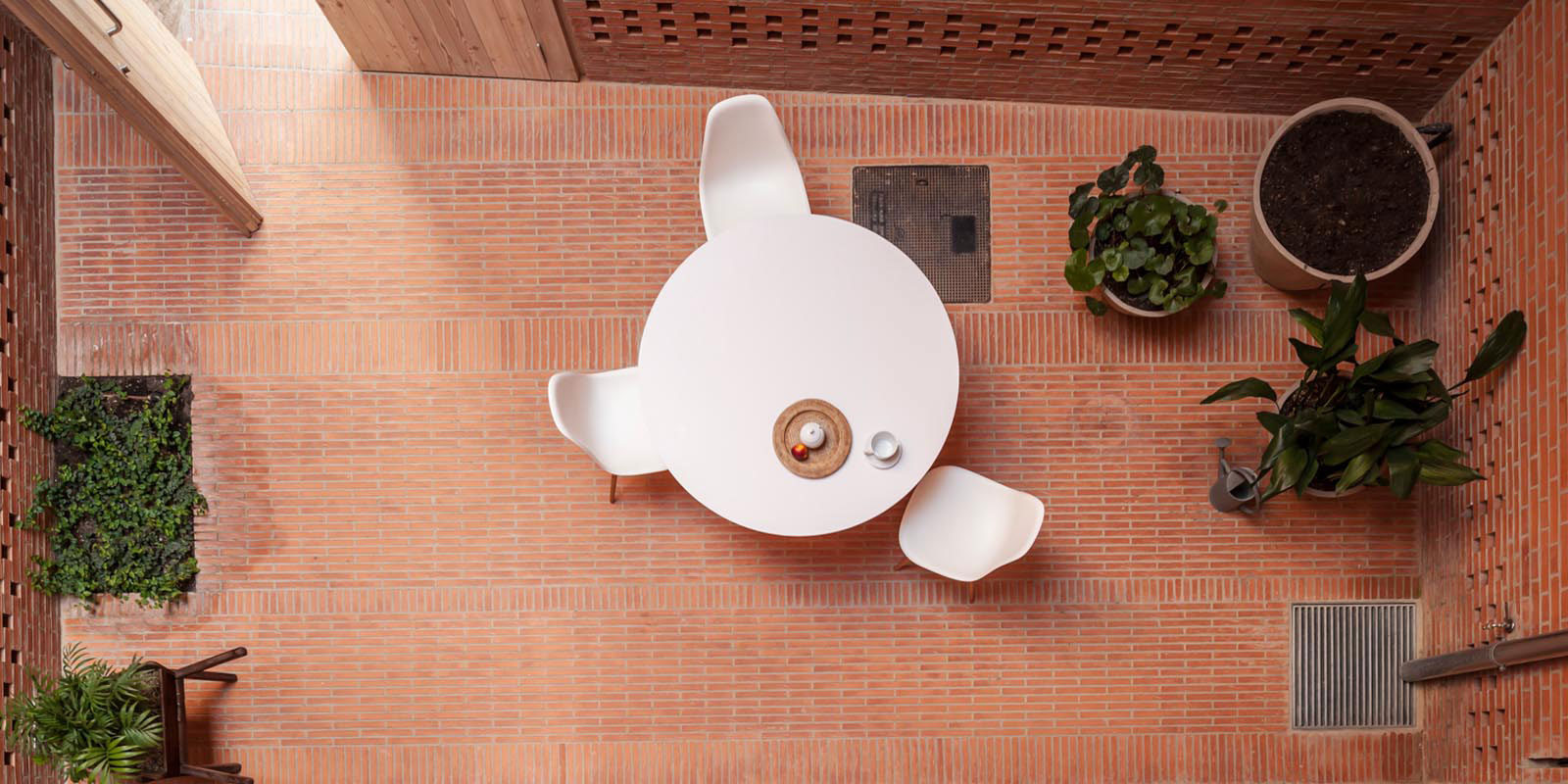 Miestnosti interiéru i patio sa podieľajú na vytvorení príjemnej a stálej klímy. Vnútorná záhrada je akoby ďalšou miestnosťou a má tiež špecifickú klímu. Nemá síce vplyv na energetickú spotrebu, ale jej zeleň a keramická dlažba kompenzujú výhľad do krajiny, hoci je celá plocha obohnaná vysokým múrom.