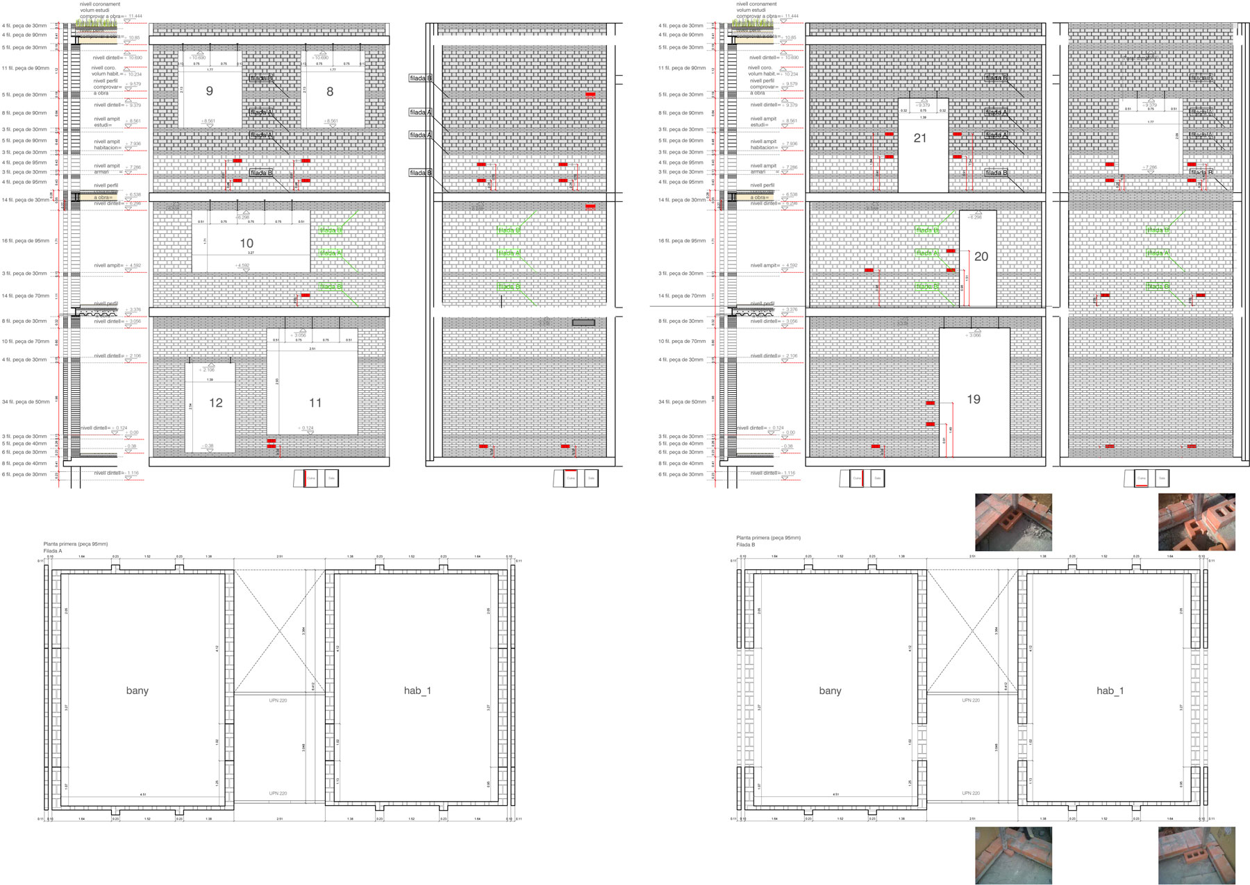 Povrch z priznanej tehly má príjemnú textúru na pohľad a v súčasnosti je aj veľmi populárny. V prípade domu číslo 1014 sa tehly stali nosnou vrstvou dvojitej fasády, ktorej tepelnoizolačná výplň sa skladá z drevených vlákien. Rozličné typy skladieb tehál majú estetické i statické opodstatnenie. Nosné steny sa rozdelili na pruhy s rôznou hustotou a veľkosťou tehál. Tam, kde sú použité menšie tehly a viac výplne, je nosná stena z tehál viac spevnená. Úzke pásy v textúre tak nielen vyznačujú, ale aj spevňujú dôležité časti fasády – preklady a rímsy. Stropná konštrukcia sa skladá z trapézových plechov, v ktorých je zabudované vykurovanie sálavým teplom. Celý systém je napojený na zemný výmenník tepla. V zime podlahy slúžia ako radiátor a v lete pohlcujú teplo.