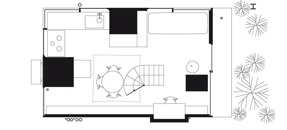 Vstupné podlažie tvorí obývačka a kuchyňa, ktoré sú hlavnými pobytovými miestnosťami počas väčšiny dňa. Zasklenie je tu čiastočne zakryté pred pohľadom z ulice krátkou stenou a zeleňou.