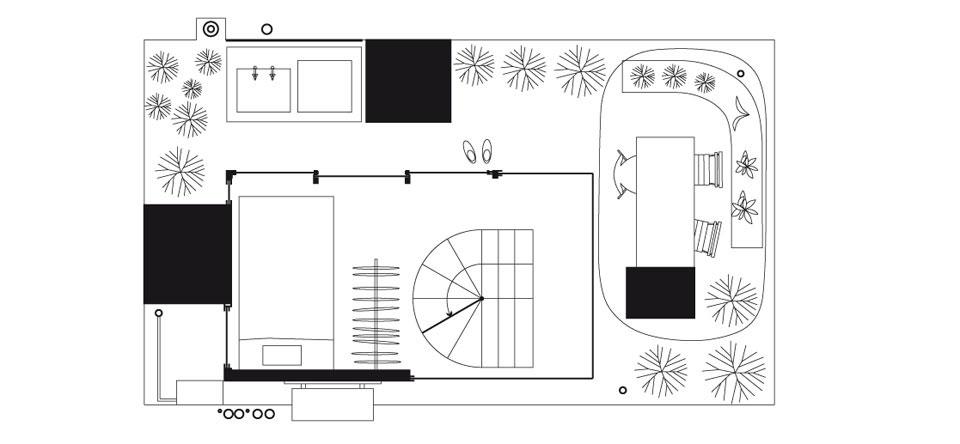 Parcela má pravidelný tvar, dom si drží od susedných objektov minimálny odstup. Steny sú okrem transparentných okien definované aj závesmi, lavicami a kvetináčmi. Tie taktiež oddeľujú jednotlivé miestnosti.