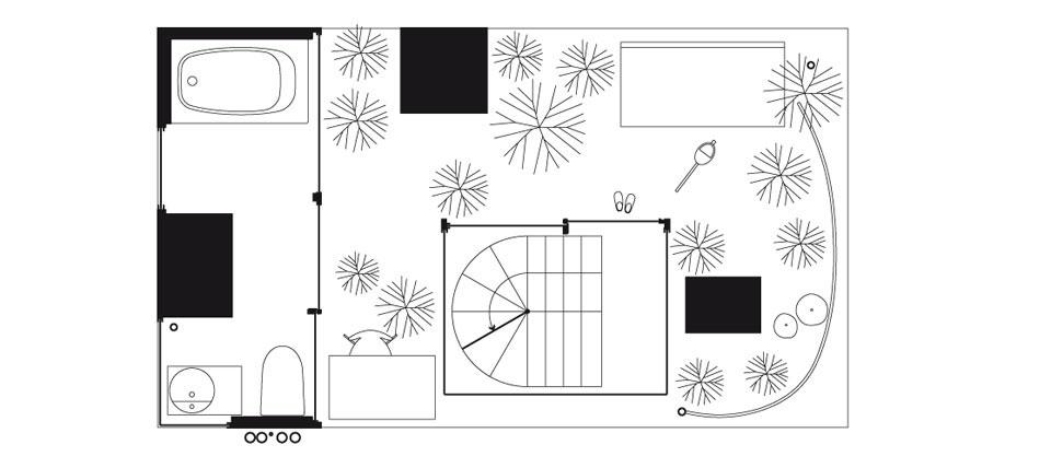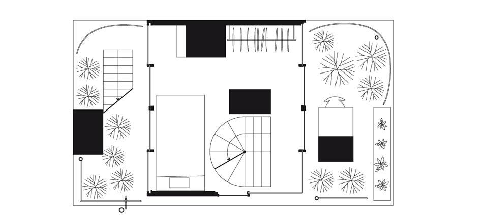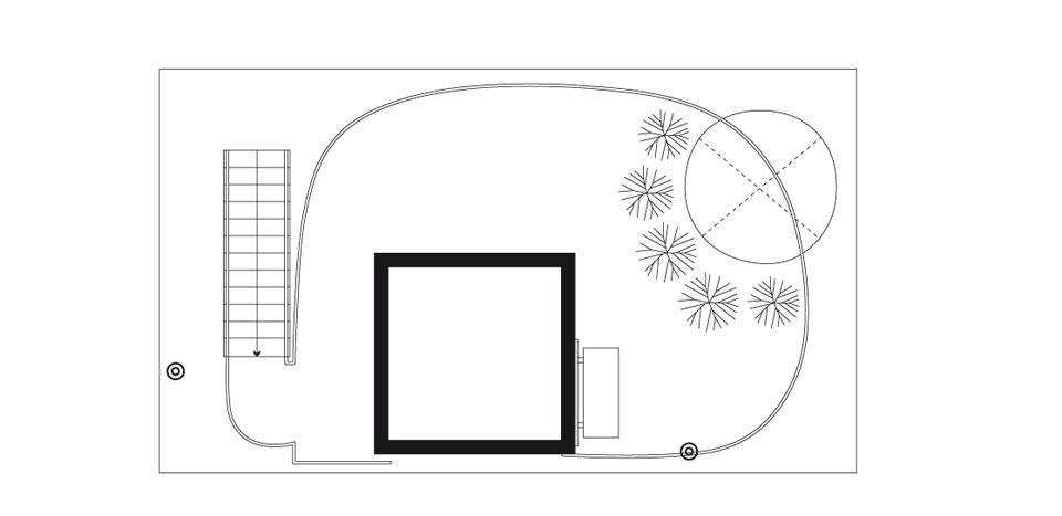 Dojem nejasnej hranice medzi interiérom a exteriérom vytvára tenká vrstva zeminy. Zeleň je súčasťou zariadenia domu a betónové mesto sa stáva len zadnou kulisou.