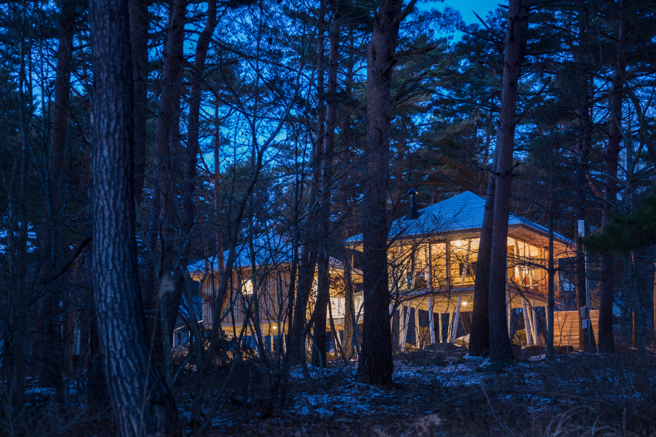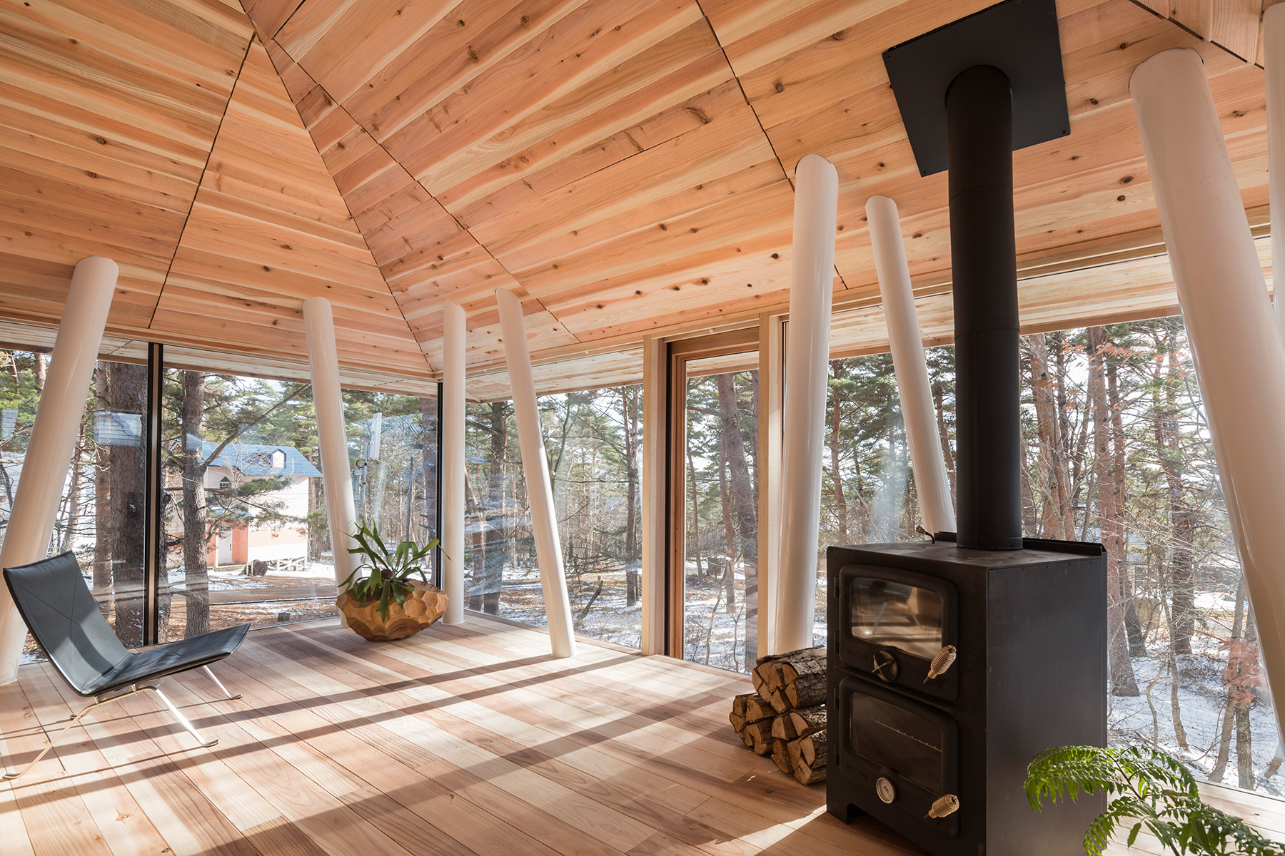 Nezvyčajný objekt zložený z dvoch domčekov na pilieroch spojených mostíkom stojí v horskom prostredí Japonska. Slúži ako druhý dom pre rodinu žijúcu v meste. Jeden z domčekov pôsobí ako vyhliadková veža a druhý ako známa chalúpka na stračej nôžke. Čo viedlo architektov k takémuto riešeniu?