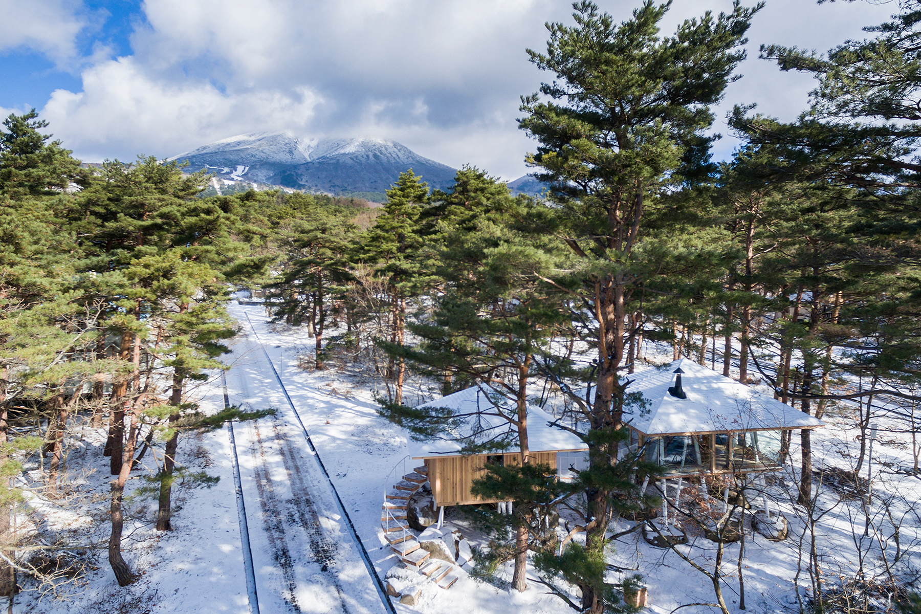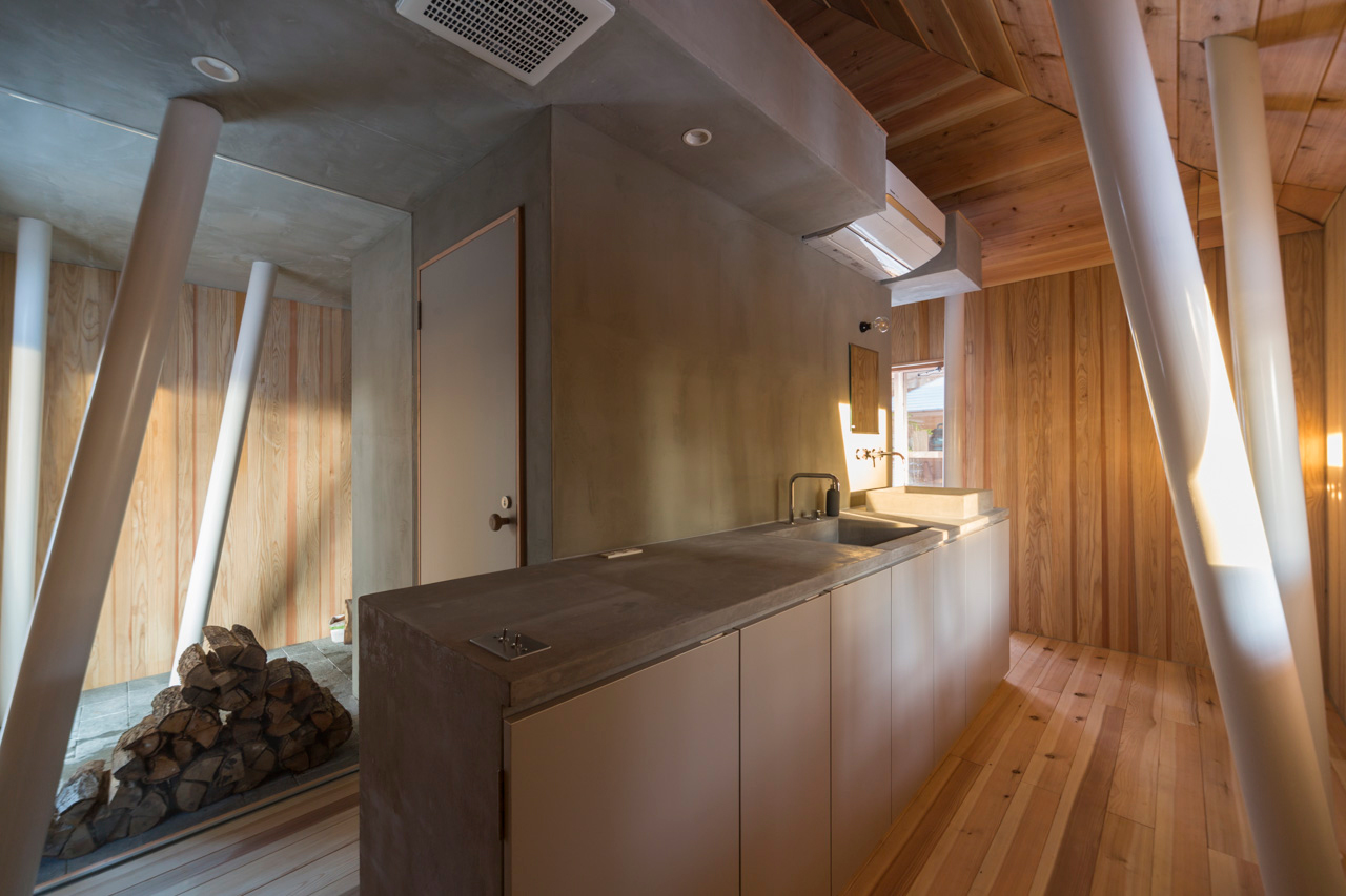 Oblasť, v ktorej sa víkendový dom nachádza, má častý problém s množstvom vody z topiaceho sa snehu. Preto architekti zo štúdia Life Style Koubou, ktorí projekt realizovali, navrhli konštrukciu vysokú viac ako dva metre, na ktorej obe časti domu stoja. Tento konštrukčný systém chráni dom pred snehom samotným a aj pred návalmi vody z topiaceho sa snehu. Každý z blokov domu má svoju funkciu a sú spojené otvoreným mostíkom. Vďaka tomuto mostíku si obyvatelia domu môžu vychutnať i drsné počasie v bezpečí a pocítiť ho všetkými zmyslami.