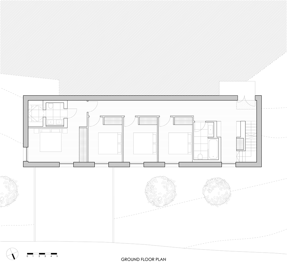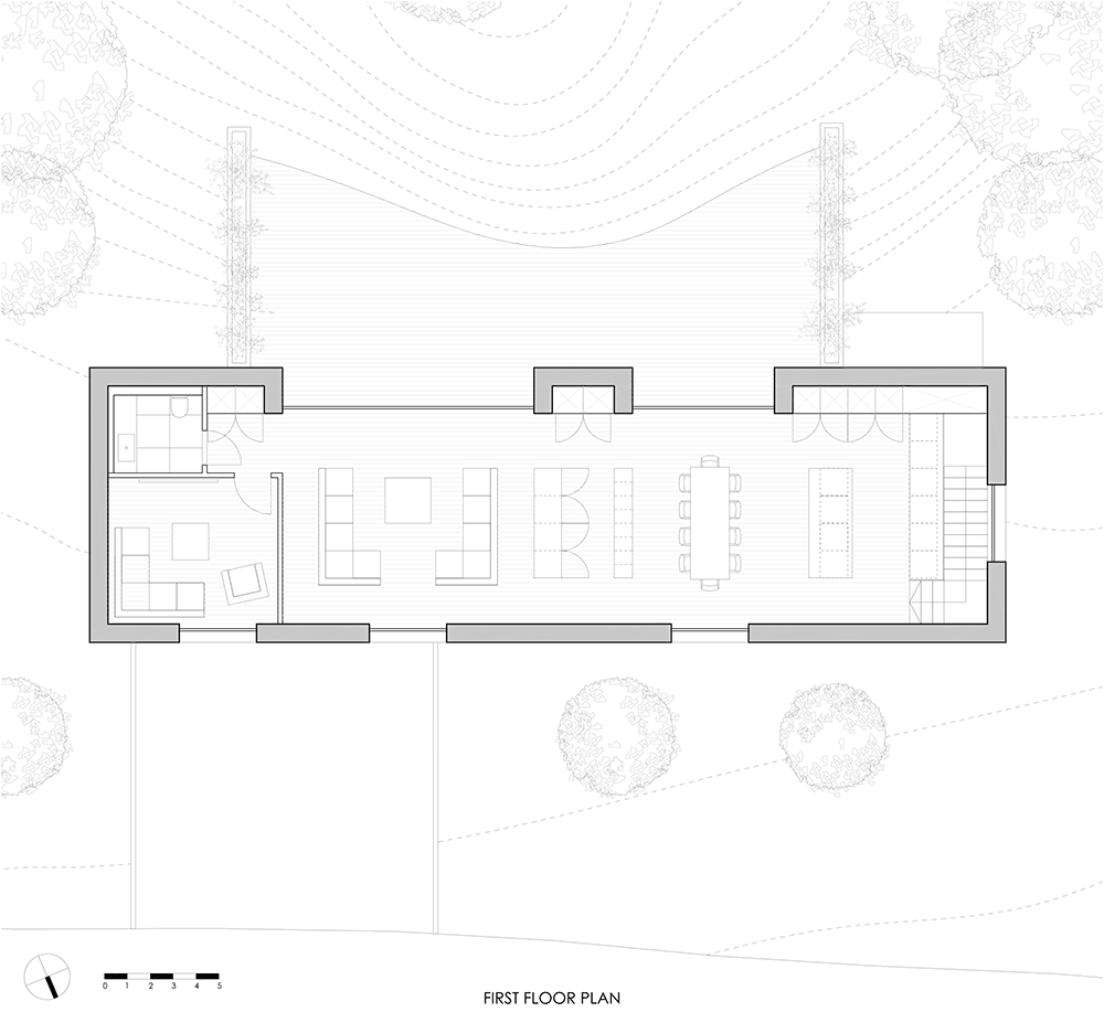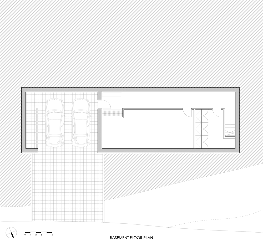 Vila má tri poschodia a keďže sa dom nachádza vo svahu, architekti zvolili obrátený systém dispozície. Spoločenská zóna objektu je na najvyššom poschodí, presvetlená zo severu aj z juhu, s možnosťou pobytu na terase. Na poschodí uprostred sú umiestnené spálne a atypicky aj hlavný vchod do domu.
