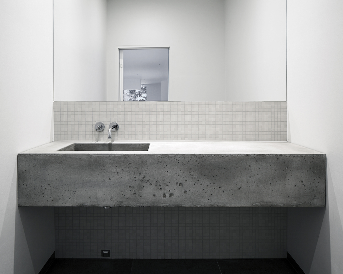 V kúpeľni bol použitý netradičný materiál pre výrobu umývadla. Okrem toho, že umývadlo bolo vyrobené z betónu, zaujímavý bol aj proces výroby, keď sa počas urýchleného tuhnutia vytvorili na povrchu malé bublinky. Svetlé a lesklé povrchy zabezpečujú, aby sa svetlo prenikajúce cez zasklené plochy distribuovalo ďalej do celej miestnosti.