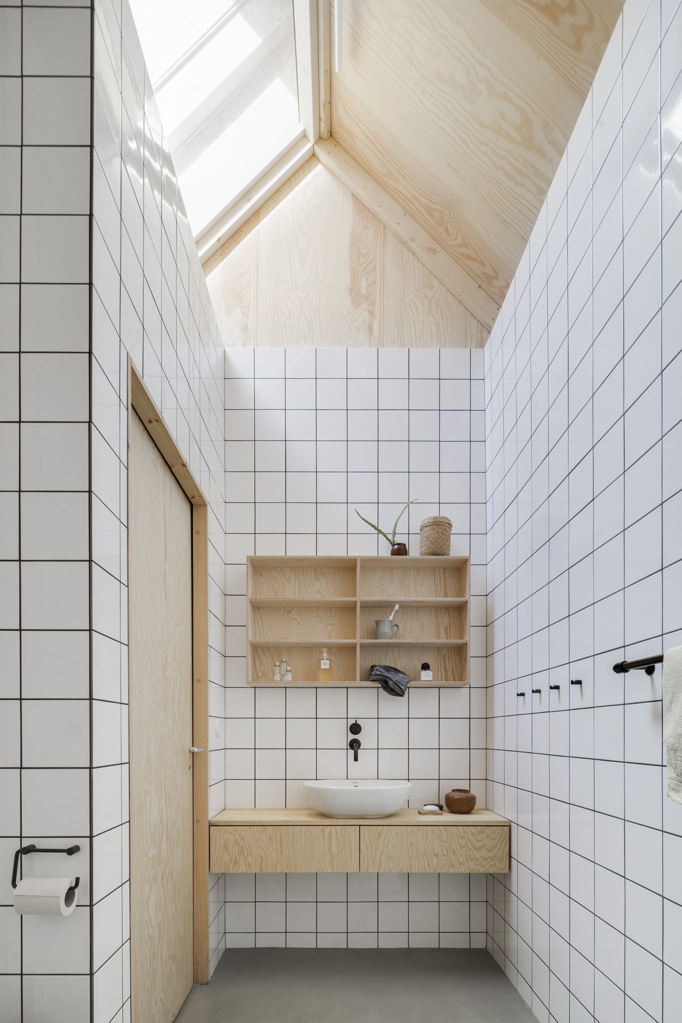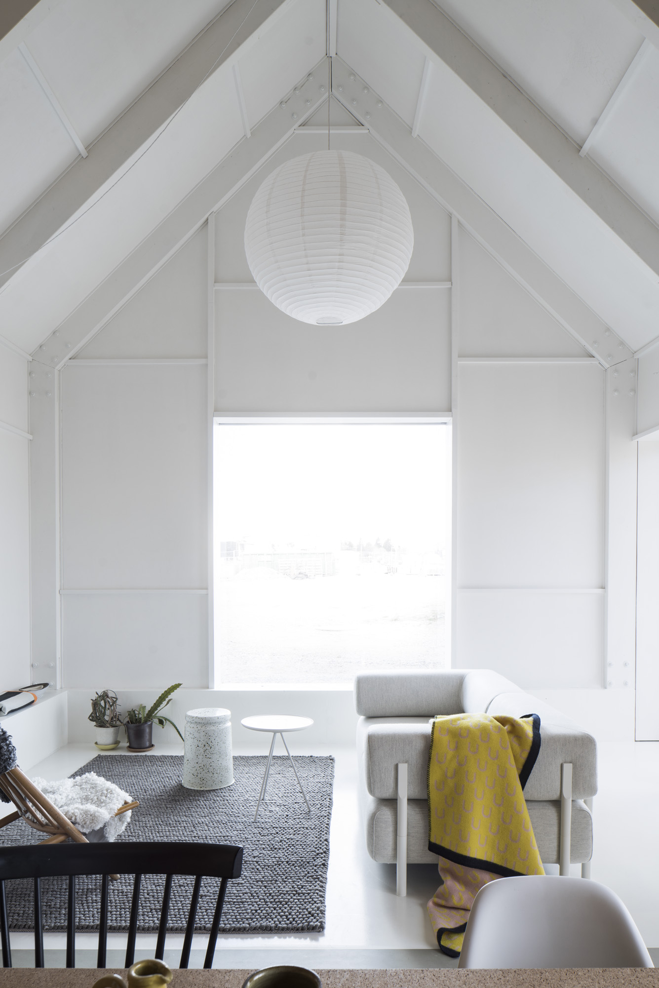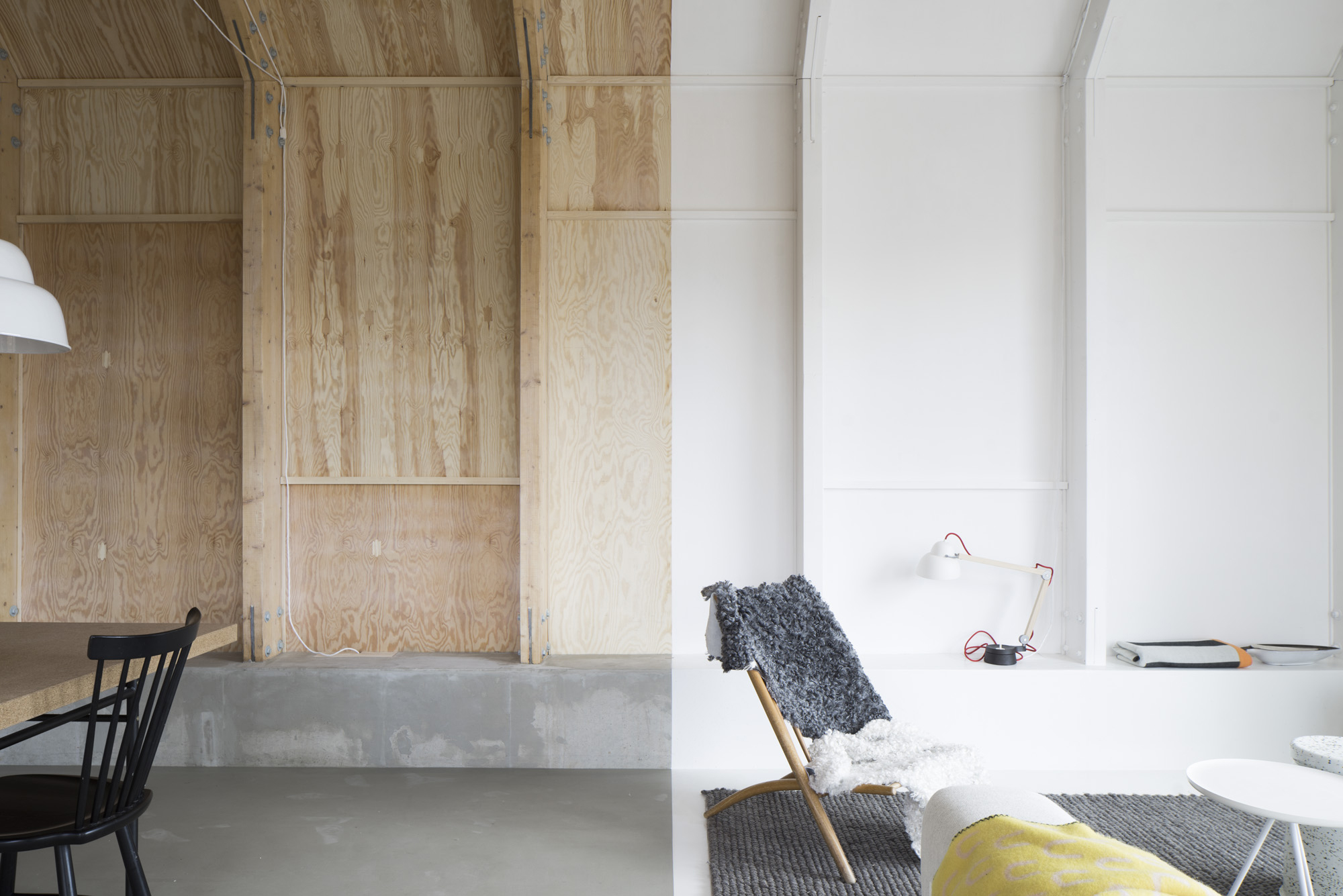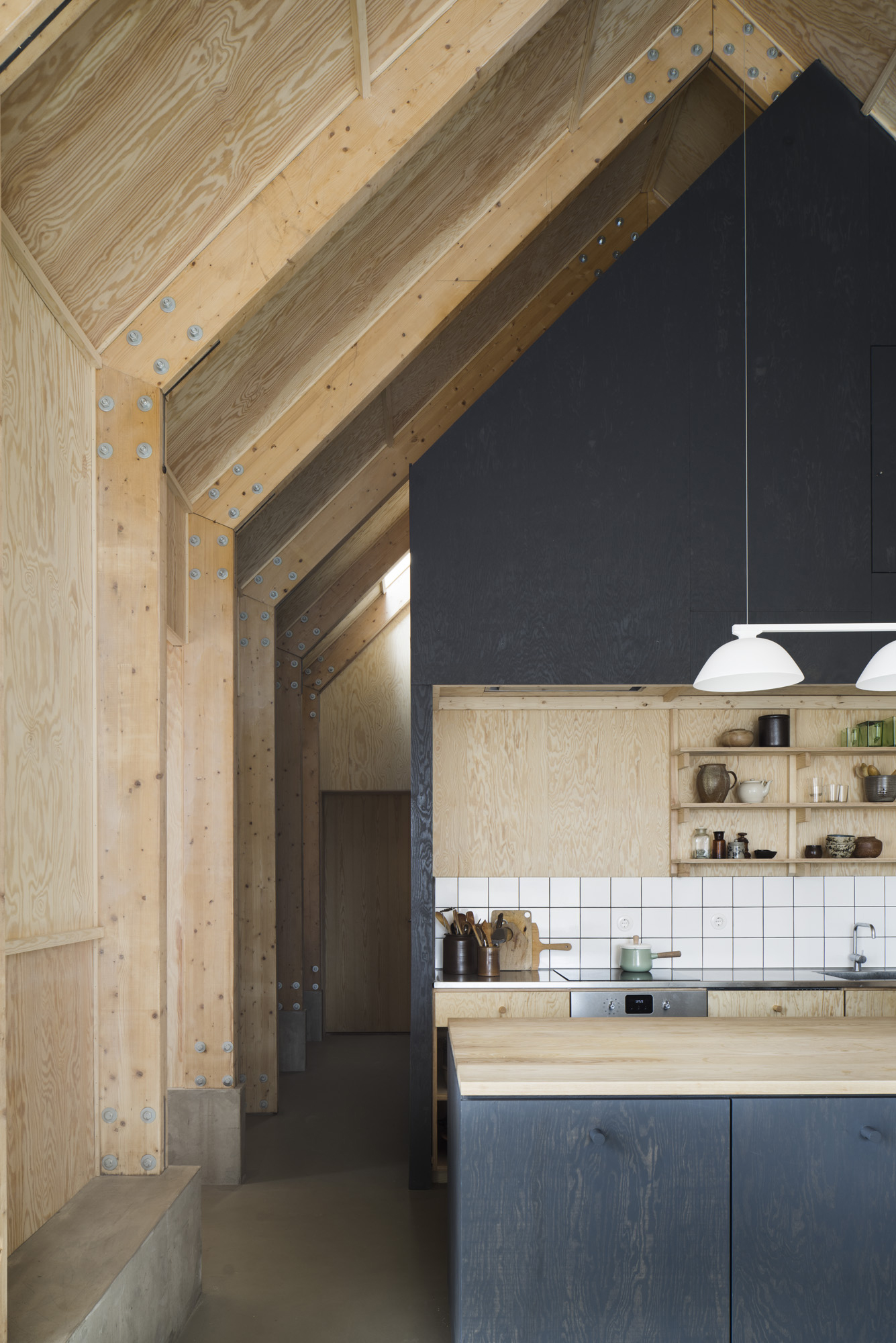 Odkazy na stodolu sú v celom projekte zrejmé, ale posunuté do nových foriem a súvislostí. Nájdeme tu napríklad obnažený drevený krov a steny obalené do preglejky, ktoré dopĺňajú celkovú škandinávsku estetiku domu.