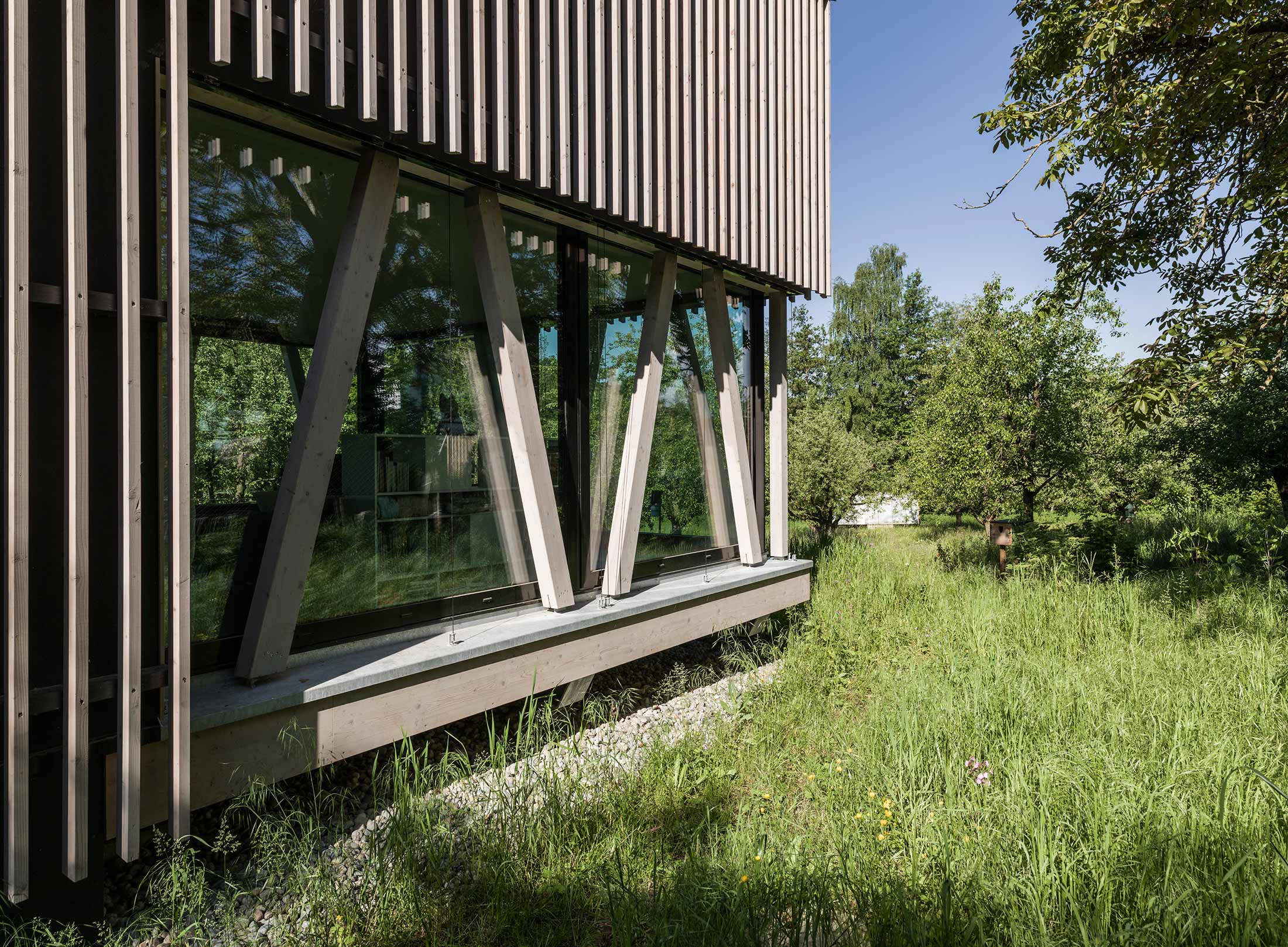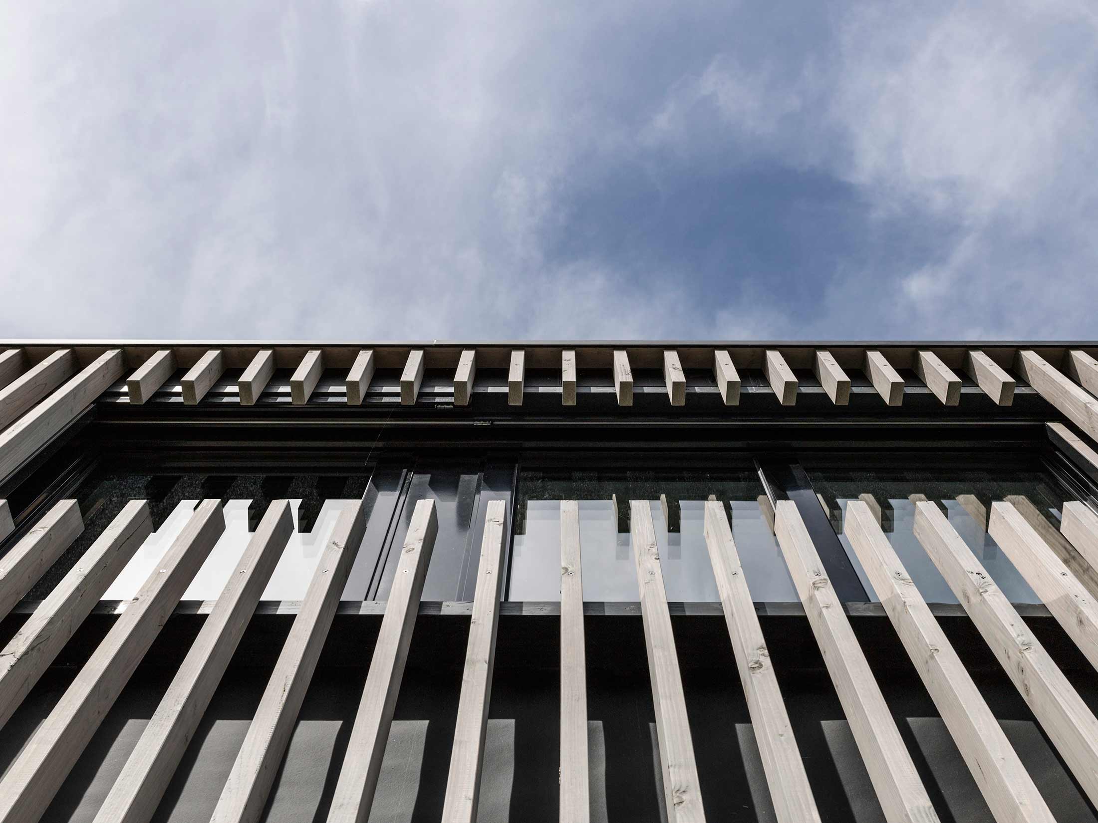 Fasáda tohto moderného domu, ktorý zároveň nesie prvky lokálnej architektúry, aby nepôsobil ako päsť na oko, je vytvorená z dreva a obsahuje charakteristické prvky okolitých tradičných stavieb.