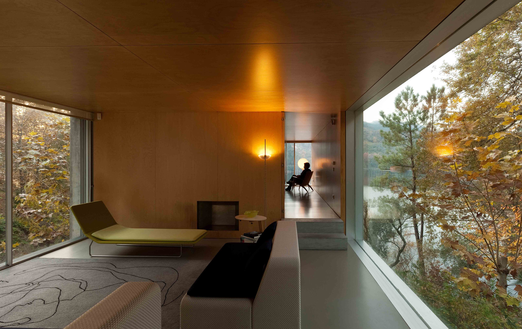 Zvonku chladný betónový dom, pripomínajúci nepravidelný balvan, zvnútra hreje obloženie takmer všetkých stien z brezového dreva. Strecha je prístupná. V časti domu, ktorá sa nachádza na mieste pôvodnej stavby, sú dve spálne, kúpeľňa, v strede dispozície obývacia miestnosť, do ktorej vedie samotný vstup do domu. V časti, ktorá sa vznáša nad svahom, je kuchynský kút s jedálňou a relaxačným miestom. Táto časť je vlastne v „teleskope“, ktorý vďaka celostenovému zaskleniu vťahuje rieku do interiéru – priamo do jedálne.