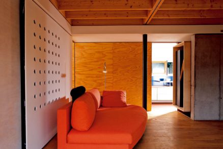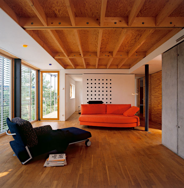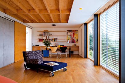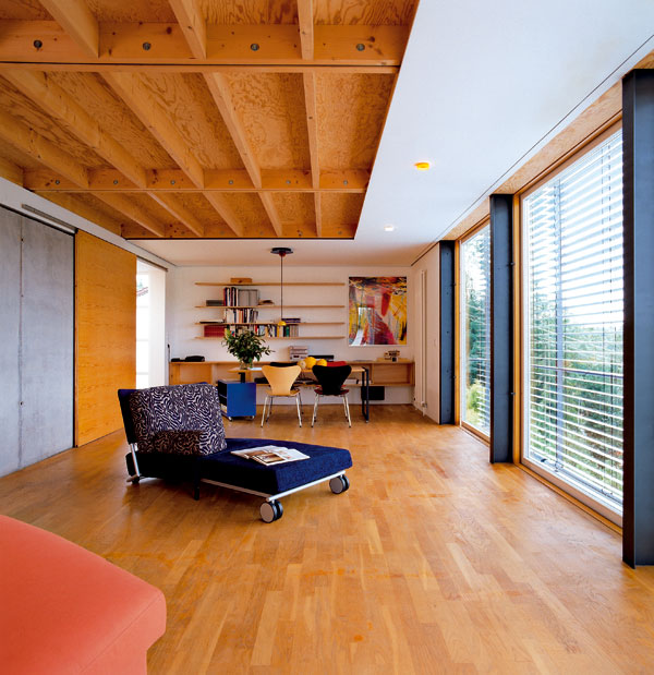 | Hlavný obytný priestor. Vonkajšie žalúzie zabraňujú v lete prenikaniu horúcich slnečných lúčov, drevené rebrá stropu zas pomáhajú pohlcovať zvuk. | ||