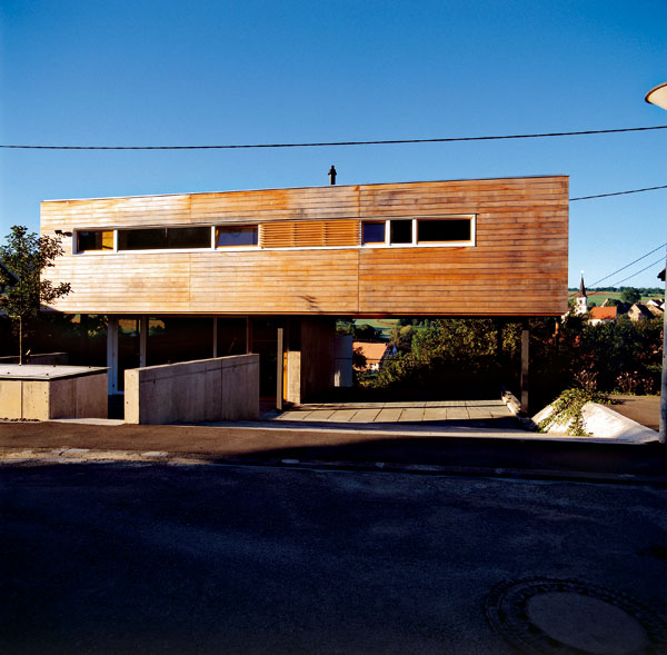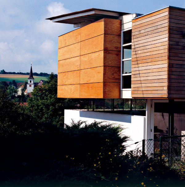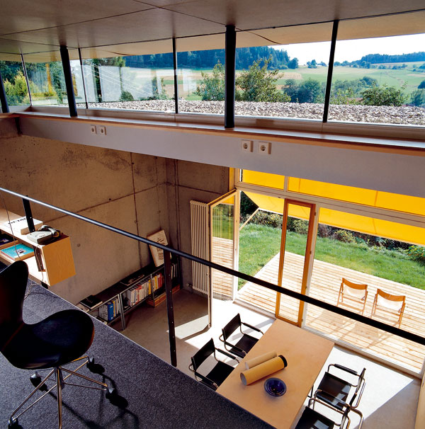 Waltraud Engeserová a Jürgen Bauer chceli využiť pozitíva a zároveň čo najviac eliminovať negatíva pozemku. Prízemie svojho domu preto orientovali netradične – dlhšou stenou kolmo na svah. Časť zapustená v zemi je tak omnoho užšia, čo znamená nižšie náklady na stavbu, ale, samozrejme, aj užší výhľad do krajiny. Keby sa nad tento základ nadstavalo druhé poschodie zvyčajným spôsobom, úžitková plocha by sa zvýšila iba o 40 štvorcových metrov.