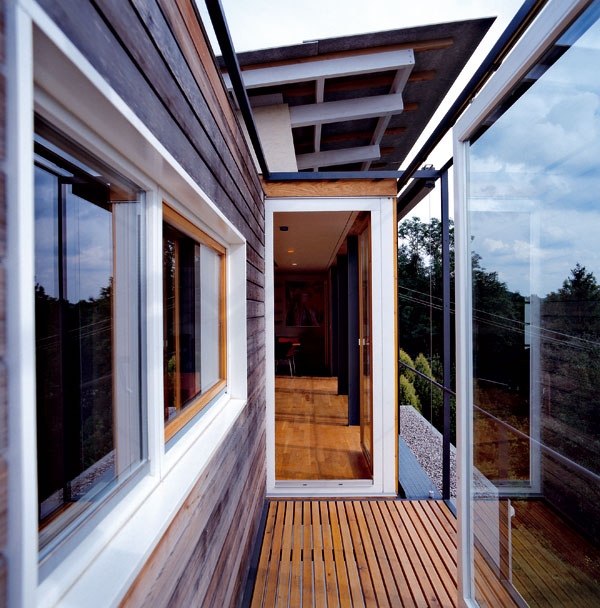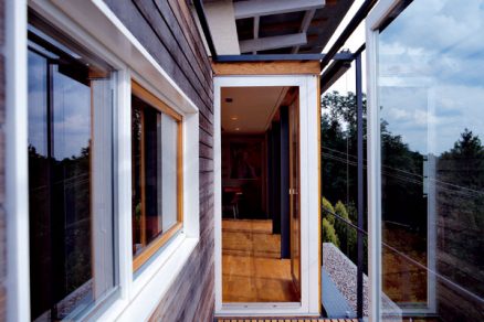 Za zmienku určite stojí aj otváranie okien v hlavnom obytnom priestore. Mnohí si určite spomenú na pôsobivý systém z vily Tugendhat, kde sa celé čelné okno zasúva do štrbiny o poschodie nižšie. V tomto prípade autori použili iný fígeľ, ale s podobným výsledkom. Okná sa posúvajú po vonkajšej stene až mimo obrysu domu, lepšie povedané na balkón. Keď sa okno odsunie, z obývacej izby vznikne akási lodžia.