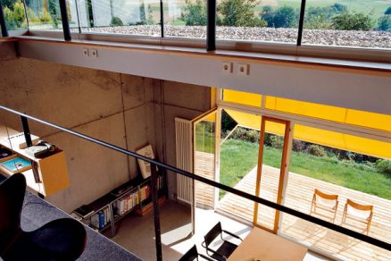 | Pásové okná medzi prvým a druhým poschodím oživili priestor vchodu a galérie a zároveň umožnili aj z týchto miest výhľad na Eschachtalské údolie. | Okná obývačky sa dajú vysunúť až mimo domu, respektíve na balkón. |