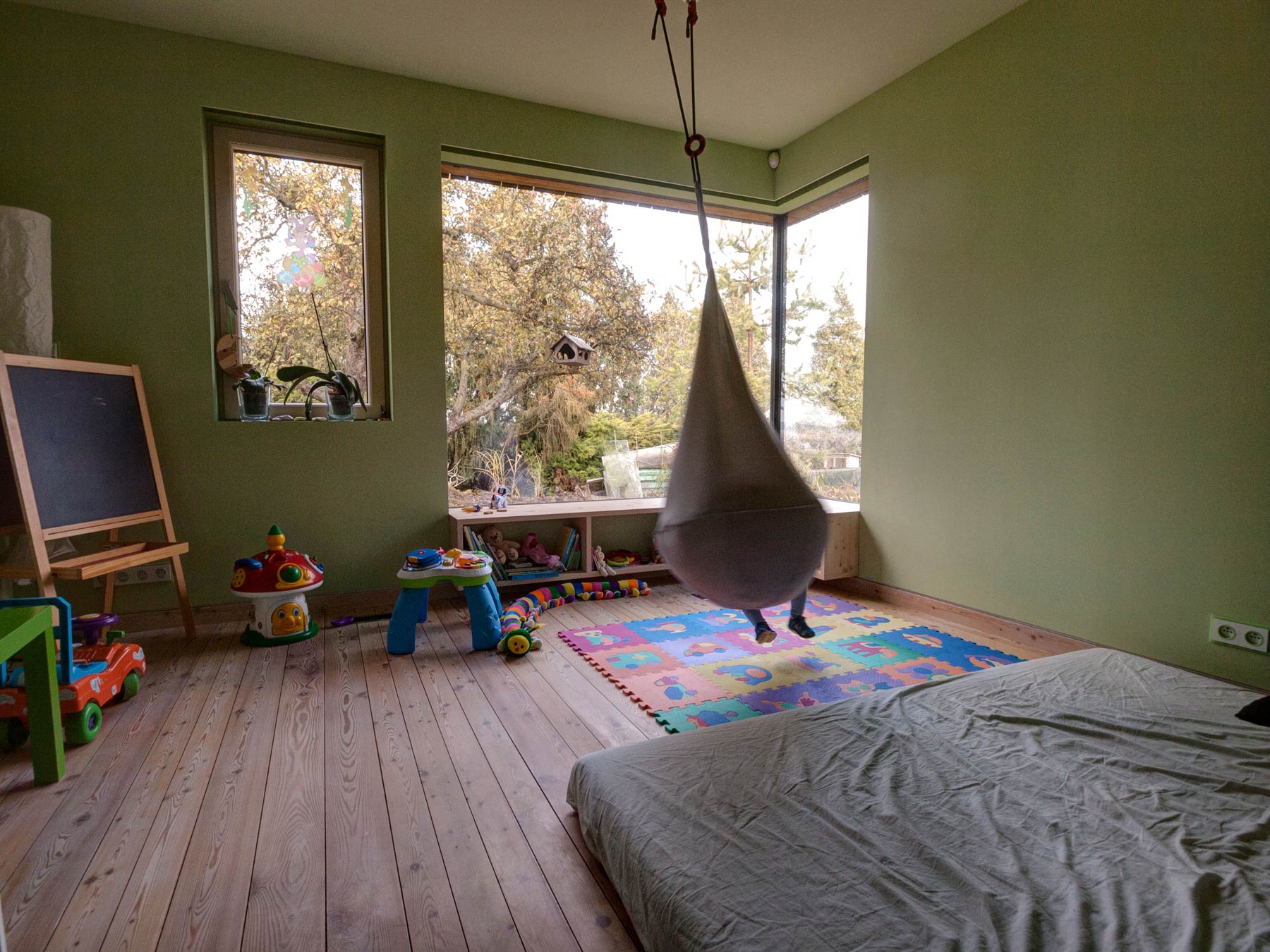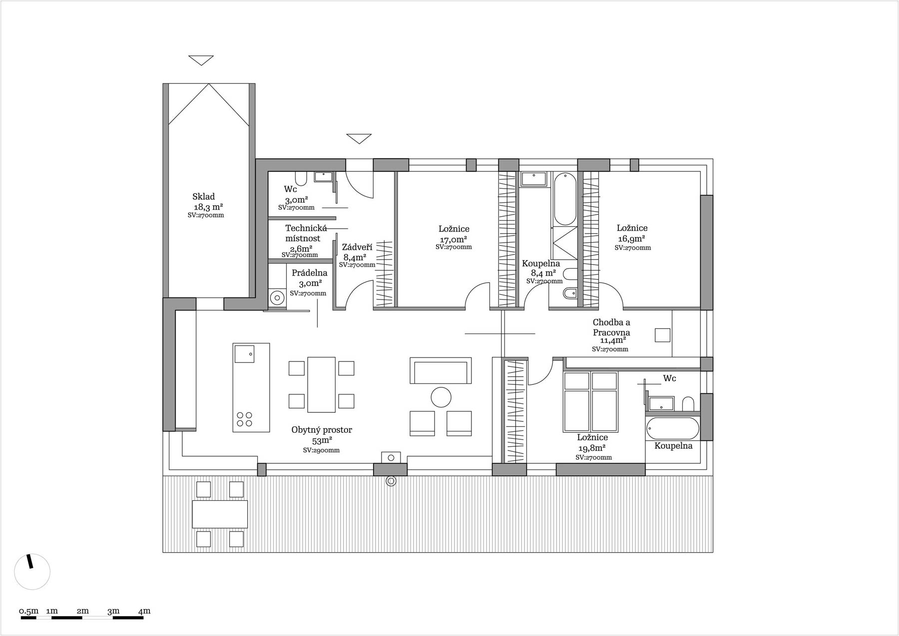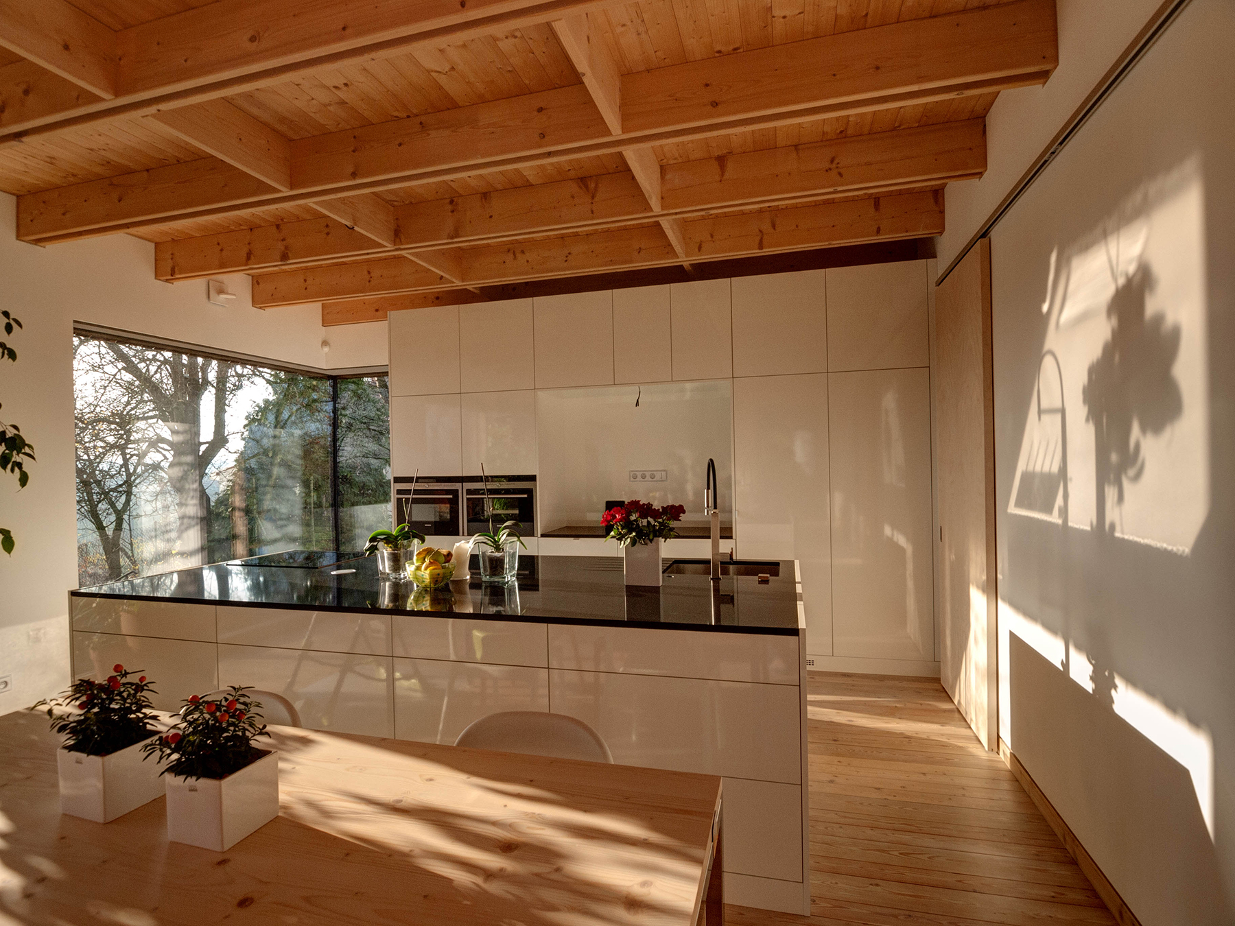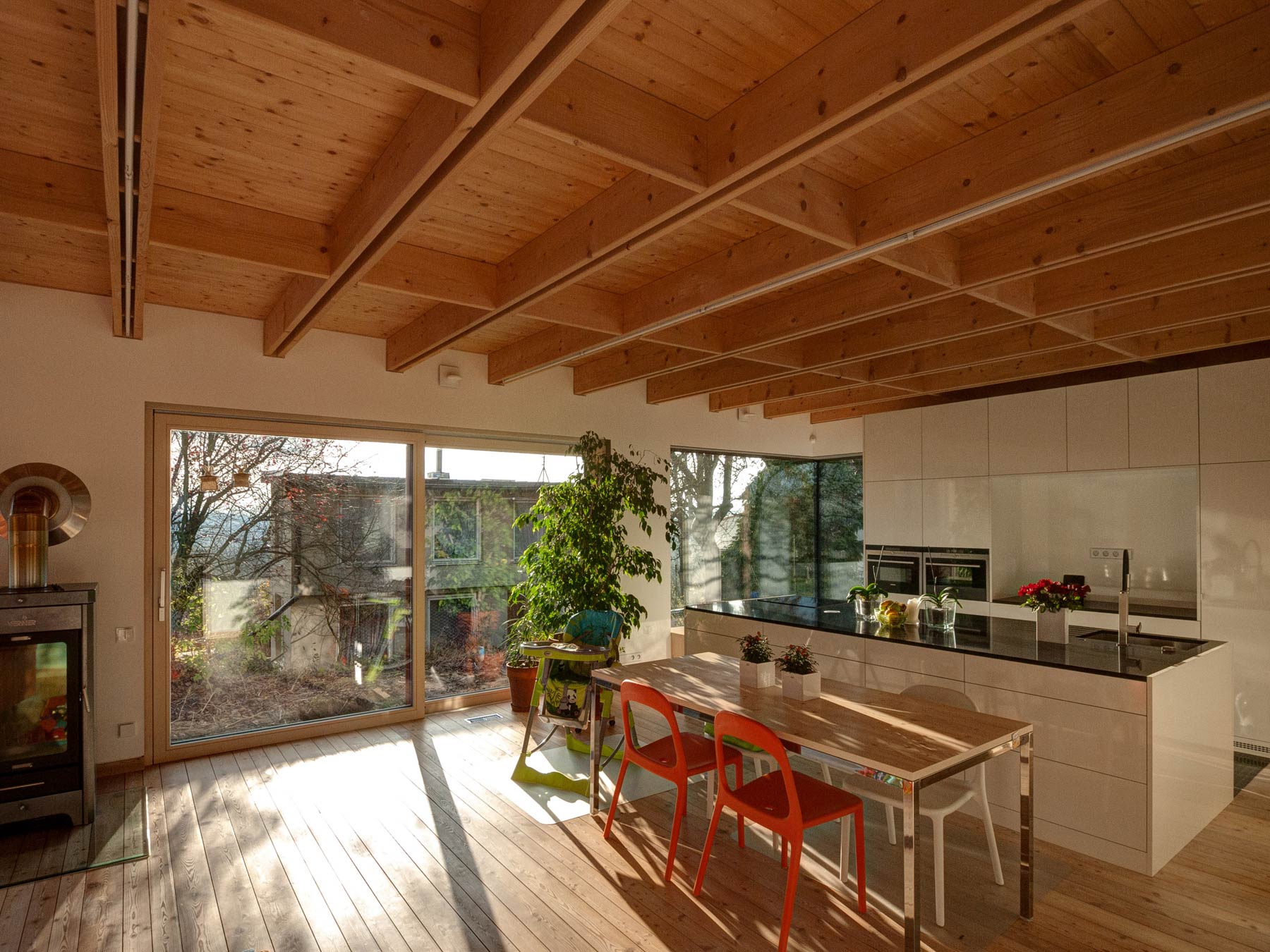 Vnútorné usporiadanie domu vychádza z jednoduchého konceptu hlavnej obytnej miestnosti s kuchyňou orientovanou na juh s výhľadom na Vysoké Mýto. Na hlavnú obytnú miestnosť nadväzujú zo severnej strany detské izby a spoločná kúpeľňa. Na západnej strane je cez chodbu – pracovňu prístup do spálne s vlastnou kúpeľňou. Na vstupe do dome zo severnej strany je umiestnená technická miestnosť a WC pre návštevy.