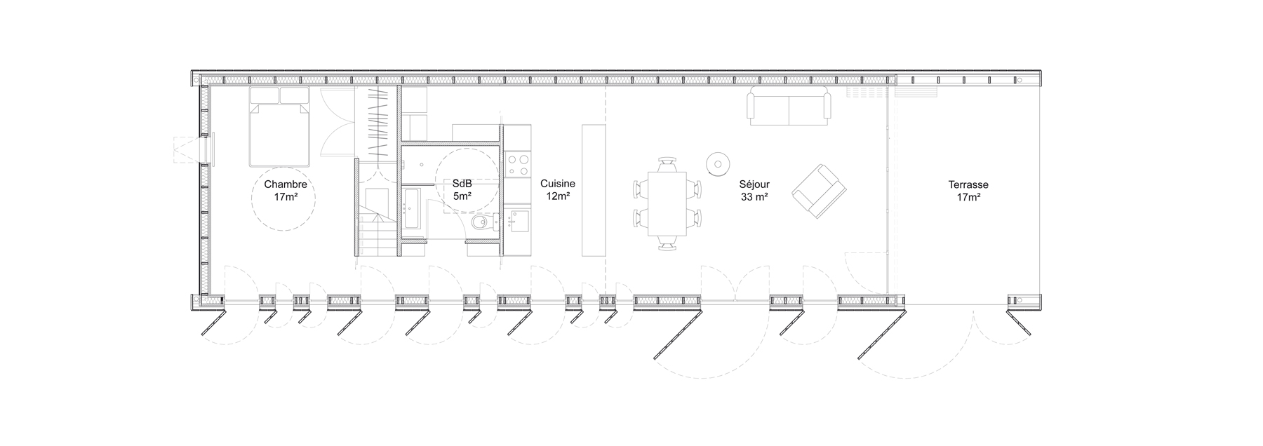Tvar domu je daný vonkajšou líniou typickej sedlovej strechy s dvomi štítmi. Tento podlhovastý tvar vytvára veľkorysý vnútorný priestor. Vlhké zóny sú situované v srdci domu. V interiéri sa použili preglejkové panely, ktoré tvoria základ pre mezanín.