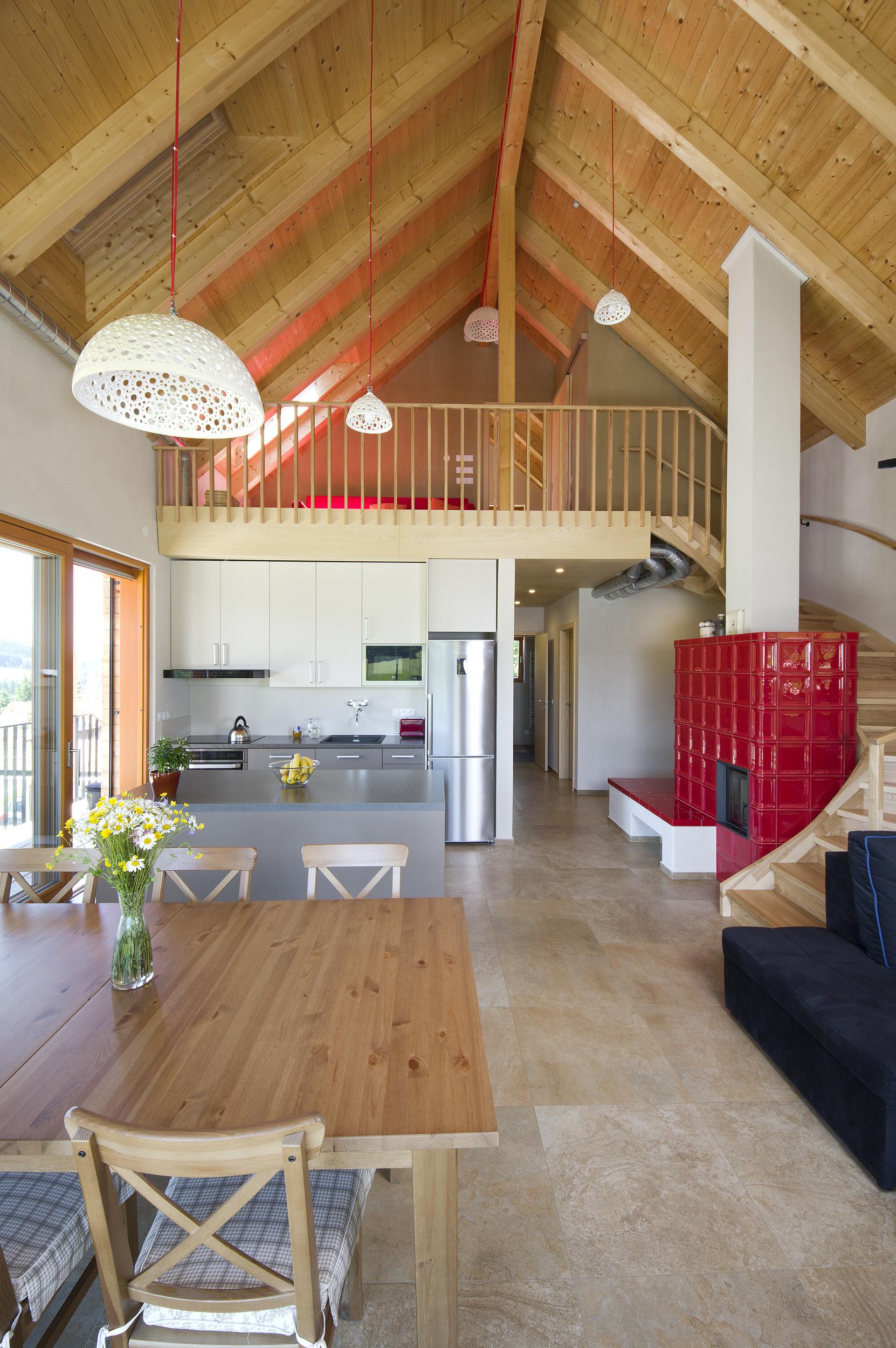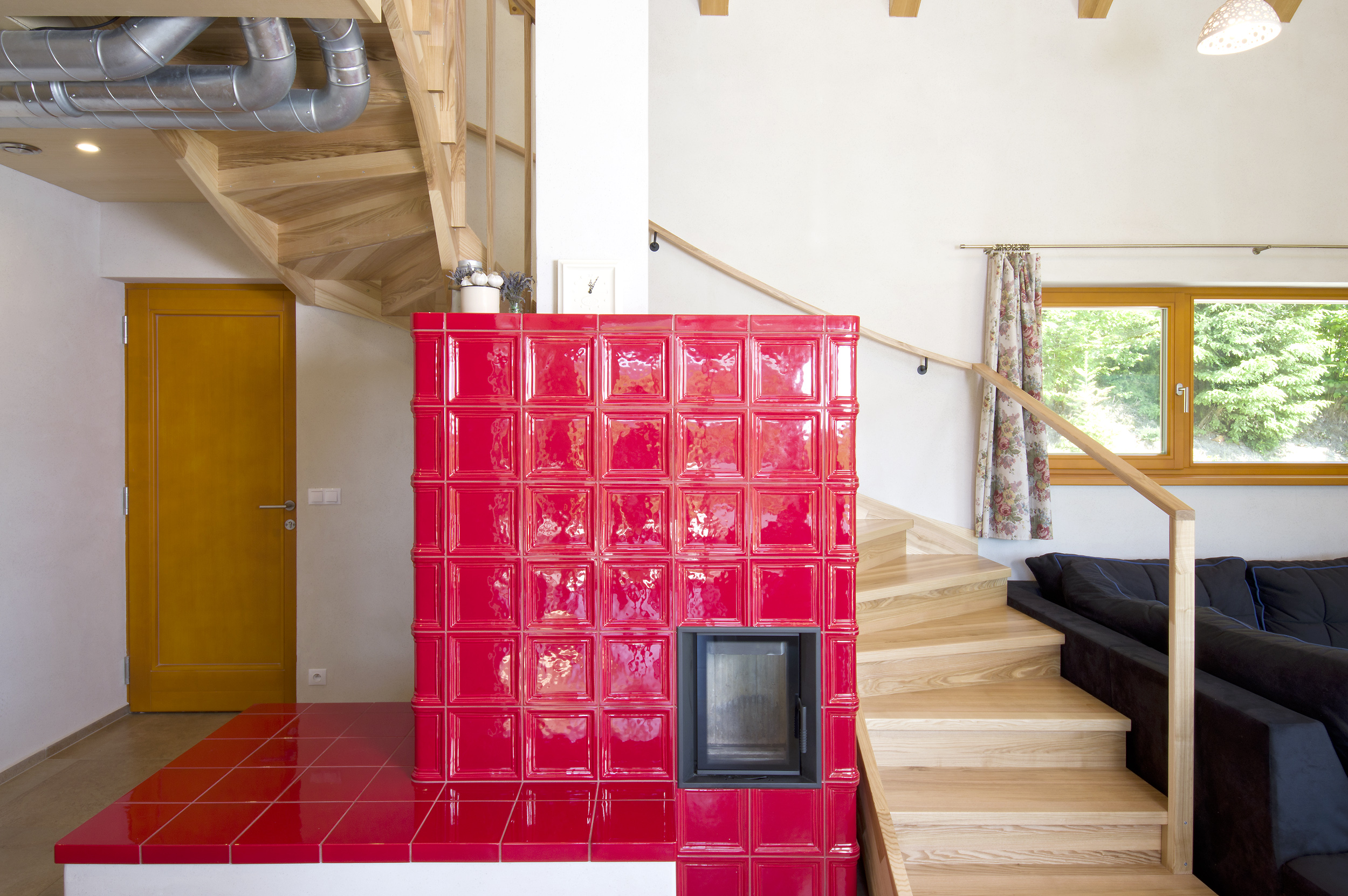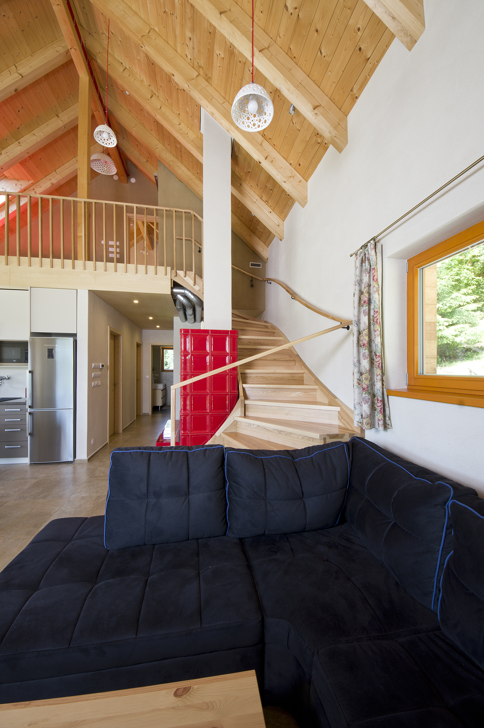 Veľká vstupná chodba nemá v tomto prípade len funkciu miestnosti, kde sa vyzúvate a odkladáte si kabáty. V tomto dome rozdeľuje vnútorný priestor na časť so spálňou, hygienickým a technickým zázemím a na veľkú obytnú časť. Obytná časť je otvorená naprieč dvoma poschodiami po strechu. Dôležitým prvkom v tejto časti je sýtočervená kachľová pec, okolo ktorej sa točí schodisko smerujúce do otvorenej galérie.