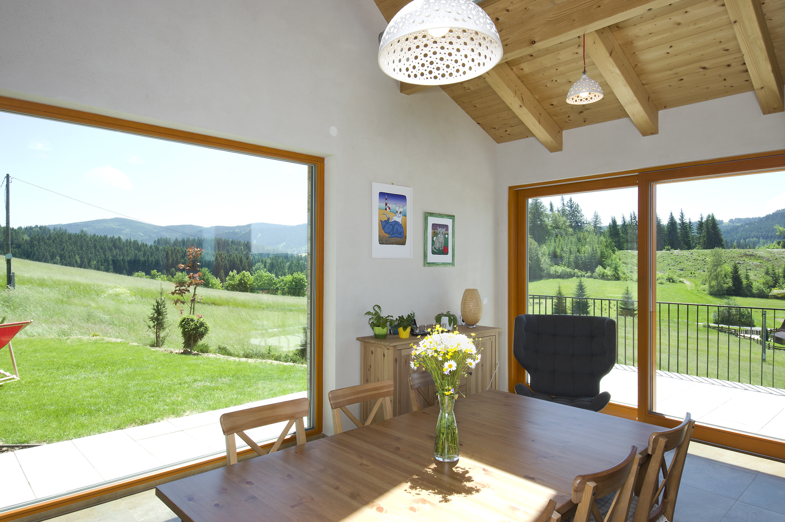 Jednoduchý obdĺžnikový tvar domu vôbec nemusí byť nudný. Absolútne nový rozmer tomuto základnému tvaru dáva veľké okno orientované na východ a zasklený výklenok orientovaný na juh a juhozápad. Tieto vymoženosti dávajú majiteľom možnosť sledovať krásny výhľad z interiéru a krajinu v závislosti od denného osvetlenia.