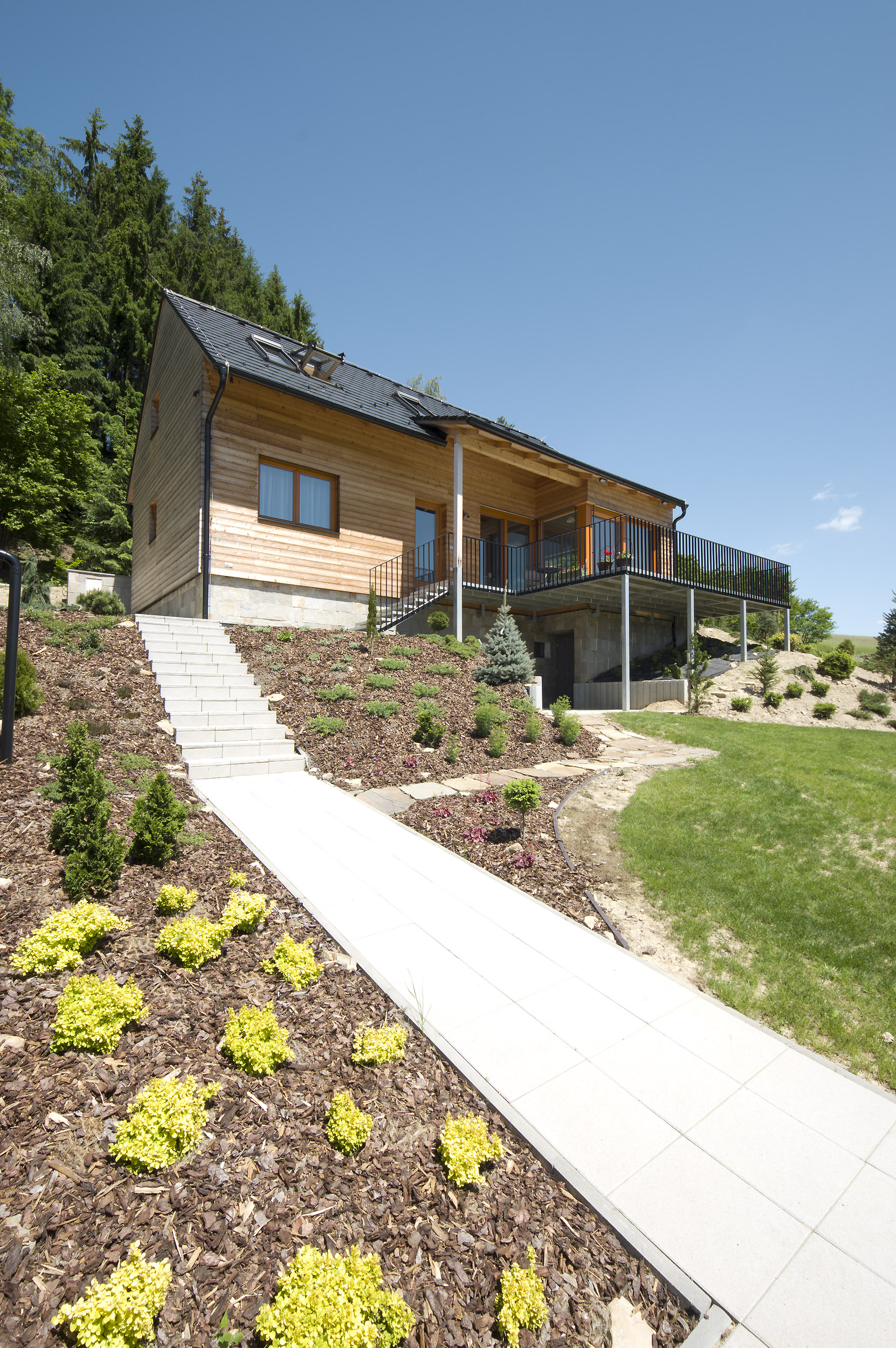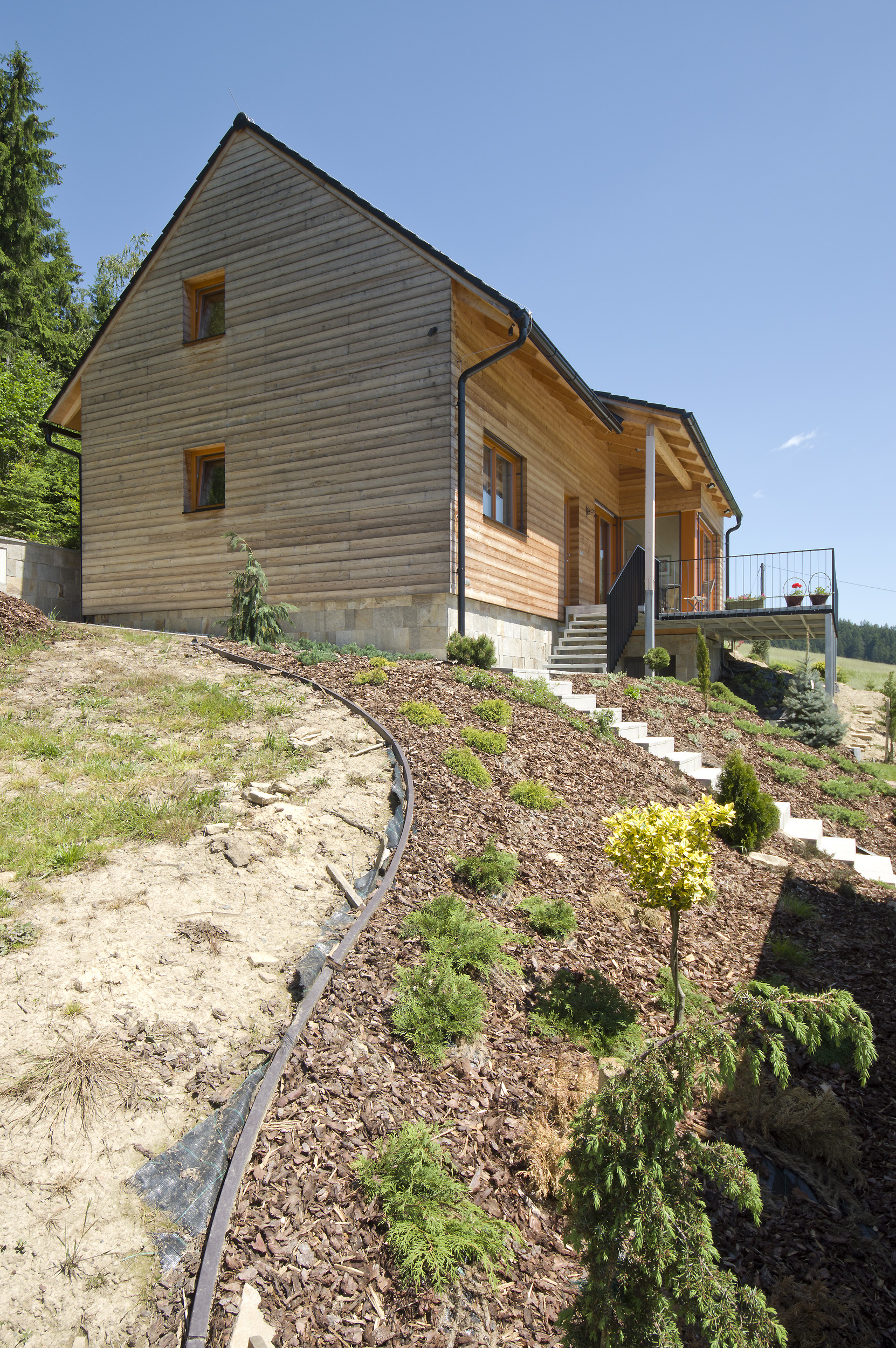 Asymetrická strecha s jemným zvlnením na jednej strane, vodorovné uloženie drevenej fasády, malebné zákutie s exteriérovým sedením pod zastrešením, otvorený výhľad do prírody z druhej strany – komu by sa to nepáčilo? Veľmi príjemný domček či skôr chata sa nachádza na svahovitom pozemku s južnou orientáciou a prekrásnym výhľadom na Hostýnsko-vsetínsku hornatinu a Javorníky.