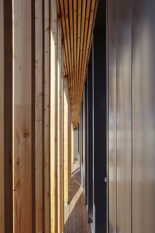 Drevo bolo pre architektov z francúzskeho ateliéru N+B Architectes jasnou voľbou. Nešlo len o jeho kvality z hľadiska ekologickej šetrnosti a trvalo udržateľnej architektúry, ale zároveň umožnilo nenásilné včlenenie budovy do zalesneného okolia.Ťažiskovým prvkom budovy sa stali drevené lamely, ktoré sú nepravidelne umiestnené okolo celého objektu a vytvárajú akýsi jeho druhý plášť. Ten nielenže budovu opticky zjednocuje, ale predovšetkým účinne tieni okná kancelárií. Využitie miestnych druhov borovice korešponduje so snahou o ekologickú, ale aj ekonomickú šetrnosť a o racionálne riešenie celého projektu.