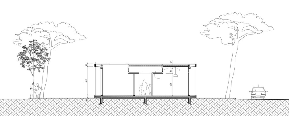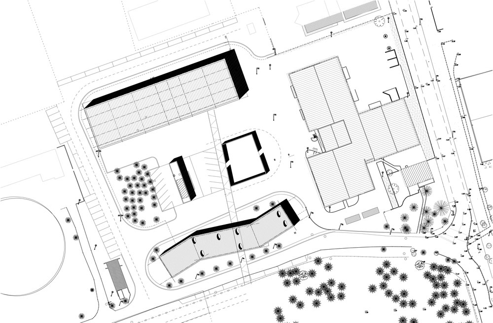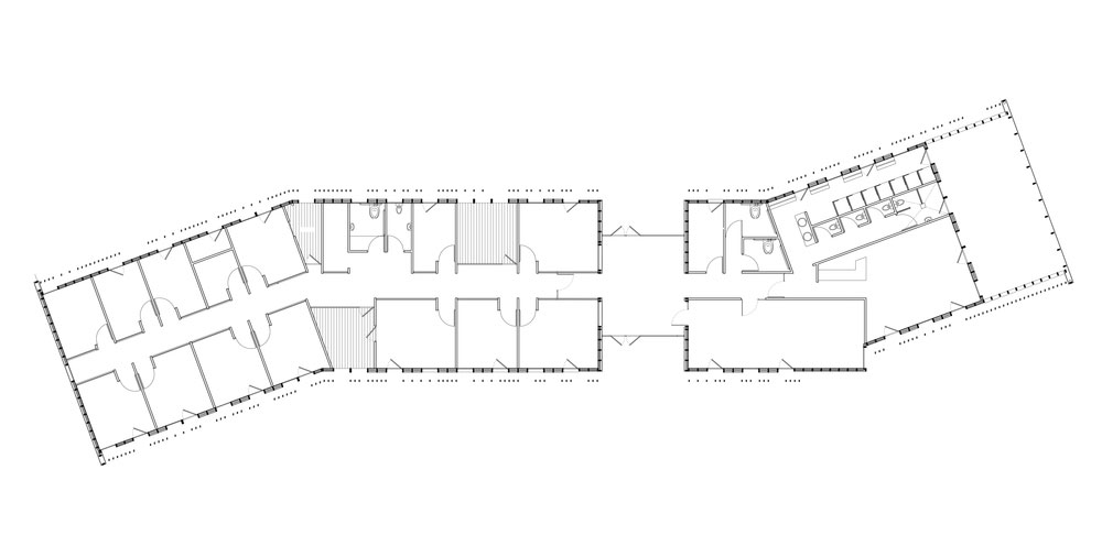 Plochá strecha vytvára jednoduchú topografickú líniu a ozvláštňuje tak jednoduchú formu stavby. Priestor má dvakrát zalomený pôdorys a je šikovne rozdelený na jednotlivé funkčné celky. Vnútorné usporiadanie sa odvíja od stredovej spojovacej chodby a je maximálne jednoduché. Pravidelný rad kancelárií miestami narúšajú vnútorné terasy, ktoré slúžia miestnym pracovníkom ako oázy plné tieňa.