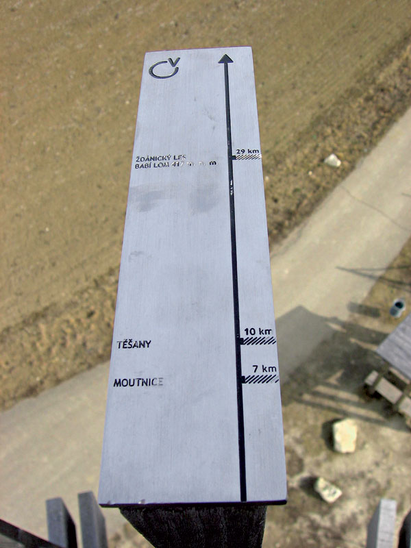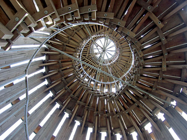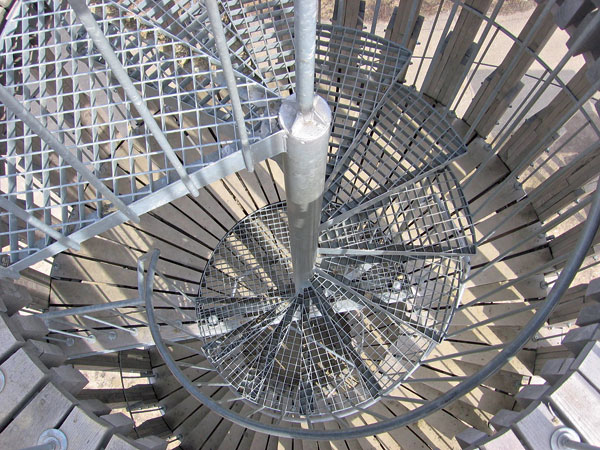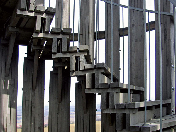 Na vrchol veže vedie 76 schodov (tri z betónu, šesťdesiatjeden je drevených a dvanásť kovových). Drevené schody spájajú kovové spojovacie prvky. Vo vnútornej časti je veža stužená pomocou kovových tyčí. Vo vrchnej časti veže vedie na vyhliadkovú plošinu dvanásť kovových schodov. Vyhliadková plošina je vo výške 14,5 metra. Keďže nosné trámy sa už v tejto výške zužujú na šírku jednej fošne, bezpečnosť návštevníkov bolo nutné zaistiť kovovým zábradlím. Na lepšiu orientáciu návštevníkov slúži značenie umiestnené na horných stranách fošní. Ide o značenie svetových strán, zaujímavých miest a ich vzdialeností od veže (v kilometroch).