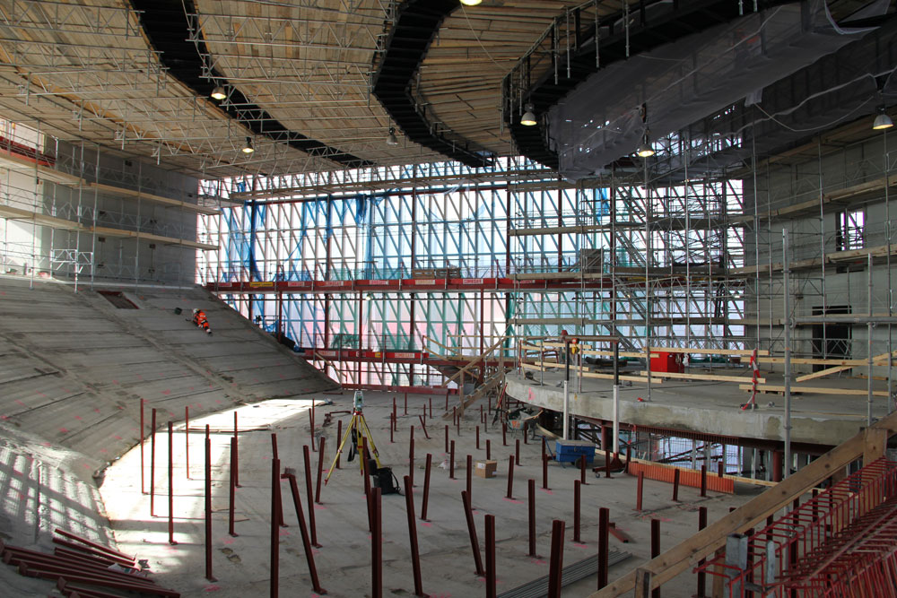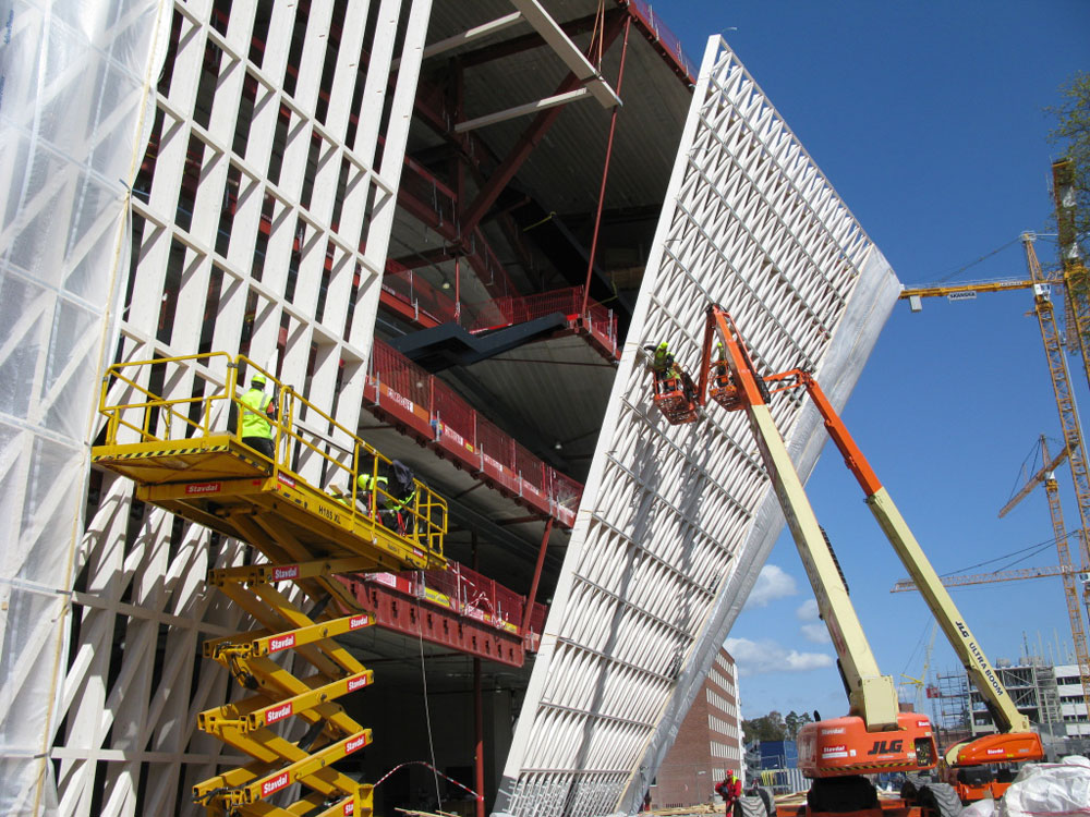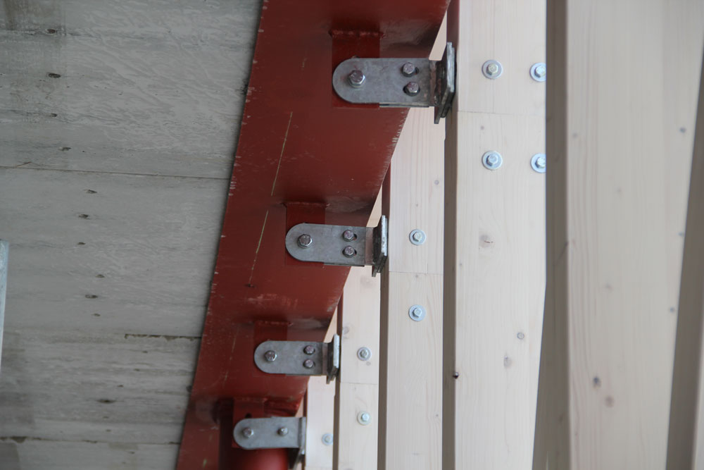 Montáž významne urýchlilo presné strojové opracovanie drevených kusov. Pred finálnym ukotvením sa priebežne geodeticky zameriavala poloha na dodržanie prísnej tolerancie. Pri zasklievaní objektu sa ukázalo, že aj v najzakrivenejšej časti sa ju podarilo dodržať.