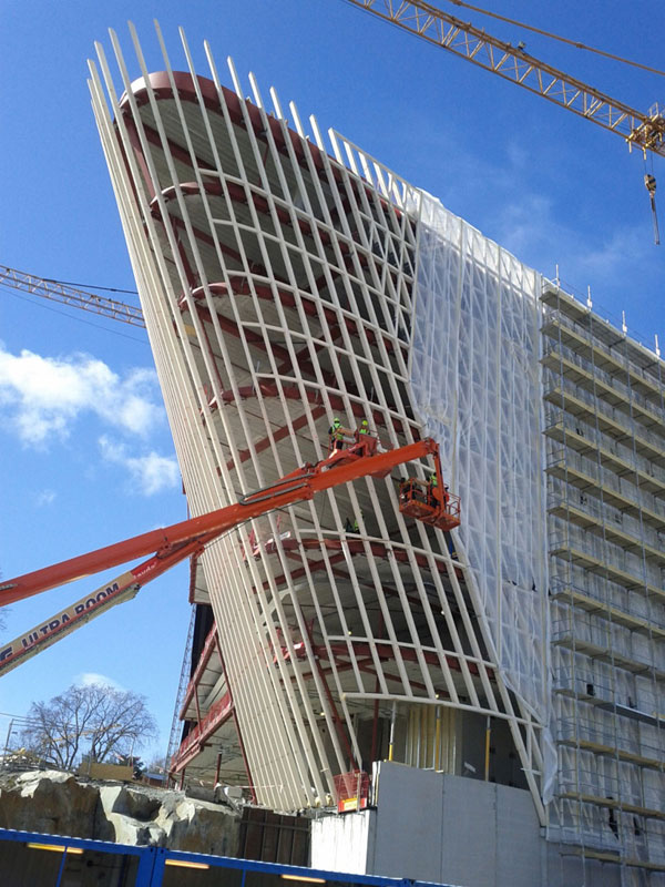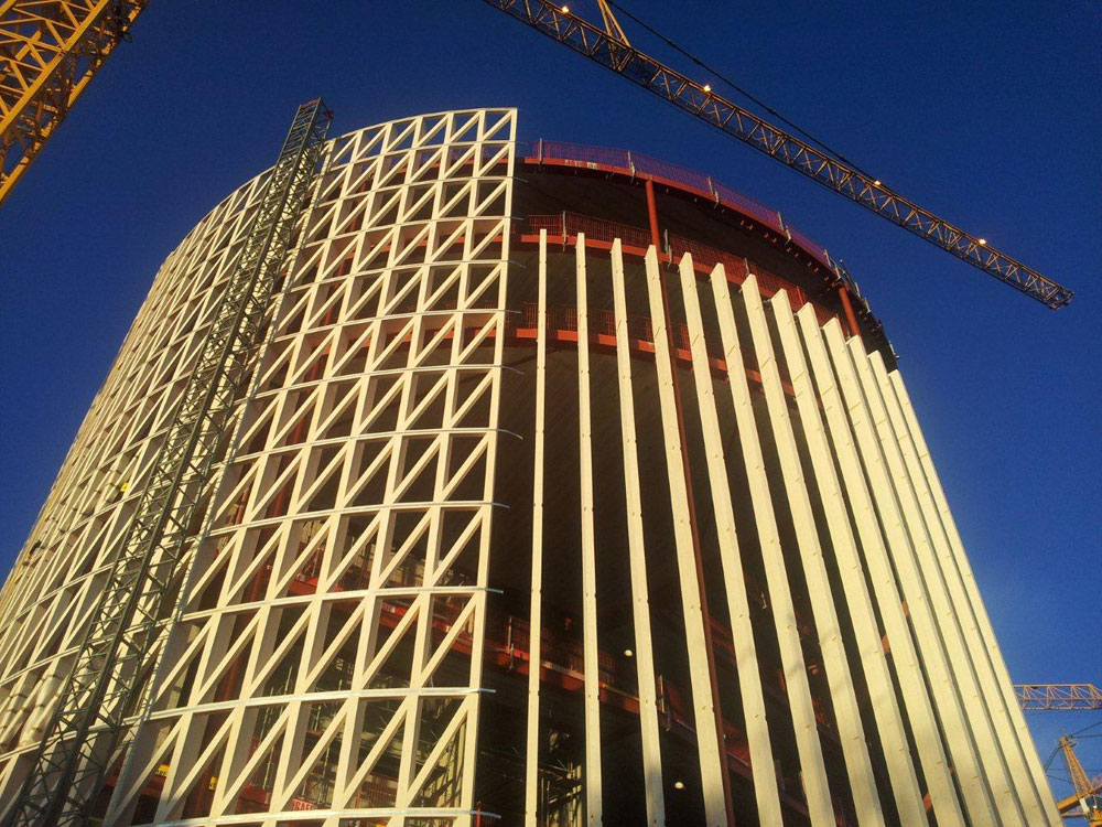 Konštrukcia budovy je oceľová s betónovým stužujúcim jadrom a betónovými stropnými predpätými doskami. Nosná konštrukcia fasády je navrhnutá ako samonosný drevený rošt, ktorý tvorí priestorovú škrupinu po celom obvode budovy.