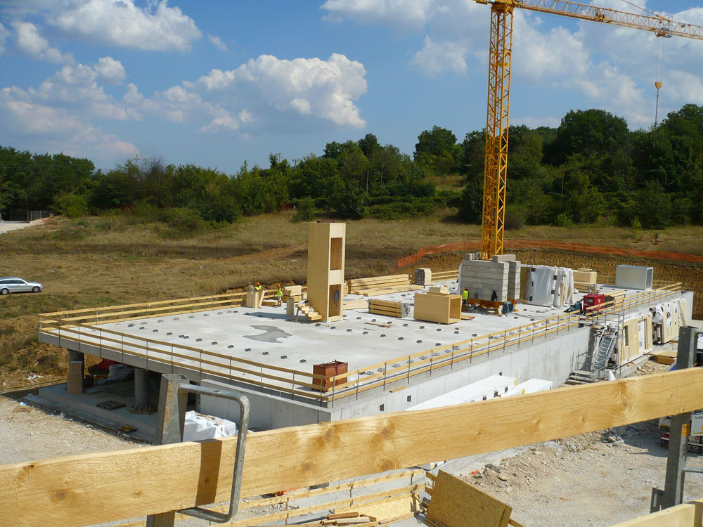 Obr. 2 Základová konštrukcia a prvé podlažie zo železobetónu, pripravené sú oceľové kotevné prvky a nosná konštrukcia schodiska. (foto: Proholz)
