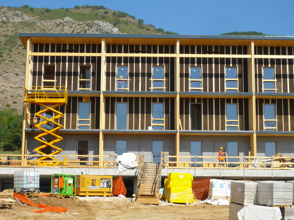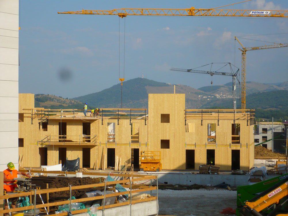 V roku 2009 bola stavba bytových domov v L’Aquila najrozsiahlejšou stavbou s drevenou nosnou konštrukciou. Na jeden dom, v ktorom sa nachádzalo 23 bytov, sa spotrebovalo približne 620 kubických metrov krížom lepeného dreva. Náklady na domy predstavovali 1 160 eur/m2 obytnej plochy [1].
