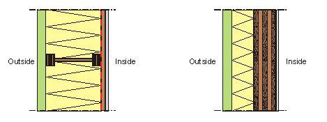Obr. 1 Priečny rez steny rámovej konštrukcie (vľavo) a masívnej konštrukcie (vpravo)