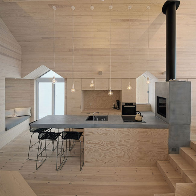 Interiér je skutočne jednoduchý, no vďaka veľkorysému využitiu dreva nepôsobí stroho ani chladne. Stavba je nádherným príkladom toho, ako sa v rámci jedného kompaktného priestoru dajú účinne spojiť tradičné prvky s modernou koncepciou.