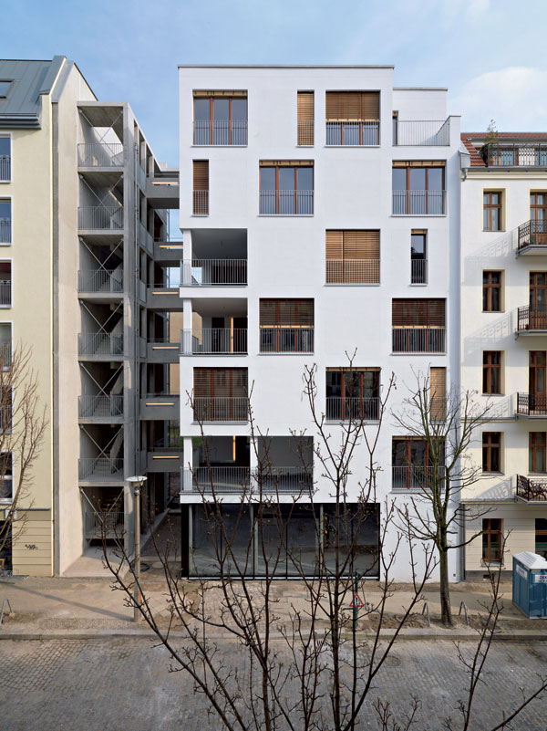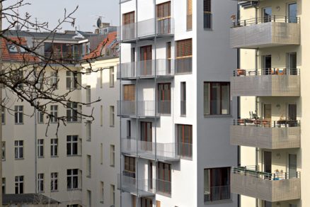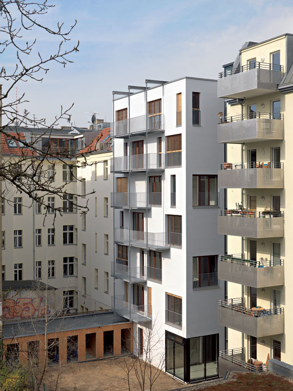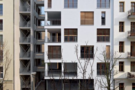 Pohľad z ulice na 7-podlažný dom s drevenou nosnou konštrukciou v Berlíne, vľavo od domu je prístupové schodisko a krátke „mostíky“ do jednotlivých bytov. Pohľad z dvora na 7-podlažný dom s drevenou nosnou konštrukciou v Berlíne