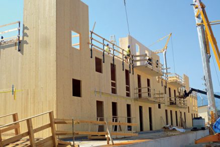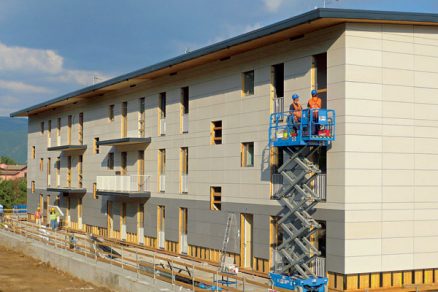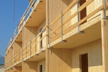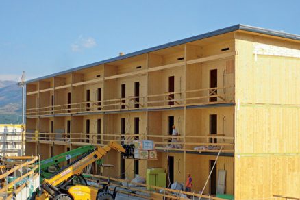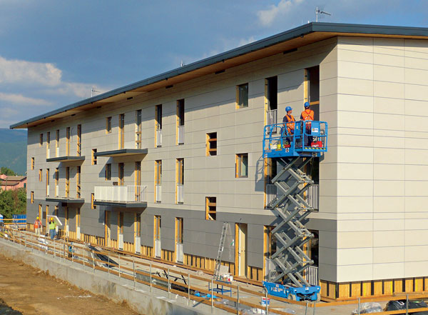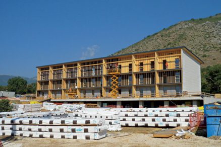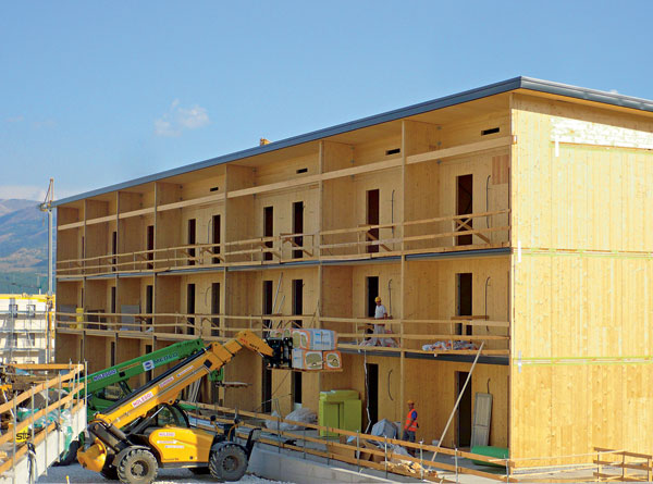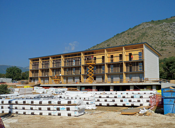Výstavba bytových viacpodlažných domov v Taliansku (L‘Aquila). Nosná konštrukcia všetkých domov je z krížom lepeného dreva.