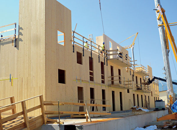 Uvedené obrázky sú z talianskeho mesta L‘Aquila, kde tender výstavby niekoľkých desiatok bytov po zemetrasení v roku 2009 vyhrali vďaka rýchlosti výstavby, dobrej požiarnej odolnosti nosnej konštrukcie a dobrej odolnosti nosnej konštrukcie proti seizmickému zaťaženiu dodávatelia domov s drevenou nosnou konštrukciou z krížom lepeného dreva.