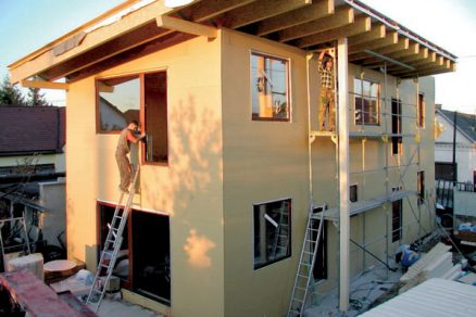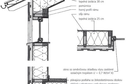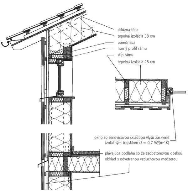 Na obr. 4 je realizovaný pasívny rodinný dom s charakteristickým rezom. Krokvy, stropnice aj stĺpiky v dome boli z kazetových nosníkov prierezov podľa obr. 5. Stena nosníkov je z OSB/3, pásnice z KVH.