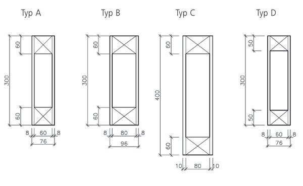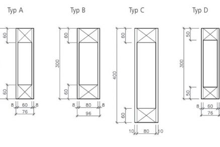 | Obr. 2 Konštrukčné detaily obalového plášťa na báze dreva pre pasívne domy. Nosný prvok rámu je zo skriňového profilu (prírezy hrubé 5 cm, opláštené OSB doskou), súčiniteľ prechodu tepla steny U = 0,14 W/(m2.K), súčiniteľ prechodu tepla strechy U = 0,11 W/(m2.K). Hodnoty U, uvedené v obrázkoch, sa vypočítali na základe posúdenia plošných teplotných polí a potvrdili experimentom v laboratóriách oddelenia drevených stavebných konštrukcií TU Zvolen. | Obr. 3 Typické prierezy tenkostenných nosníkov |